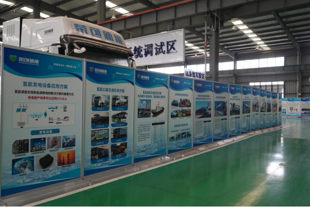▎生产车间和检测中心之间,是一条展示廊道,依次摆放着公司从成立到现在各代的氢能源燃料电池系统产品,几乎全是国内首台(套):