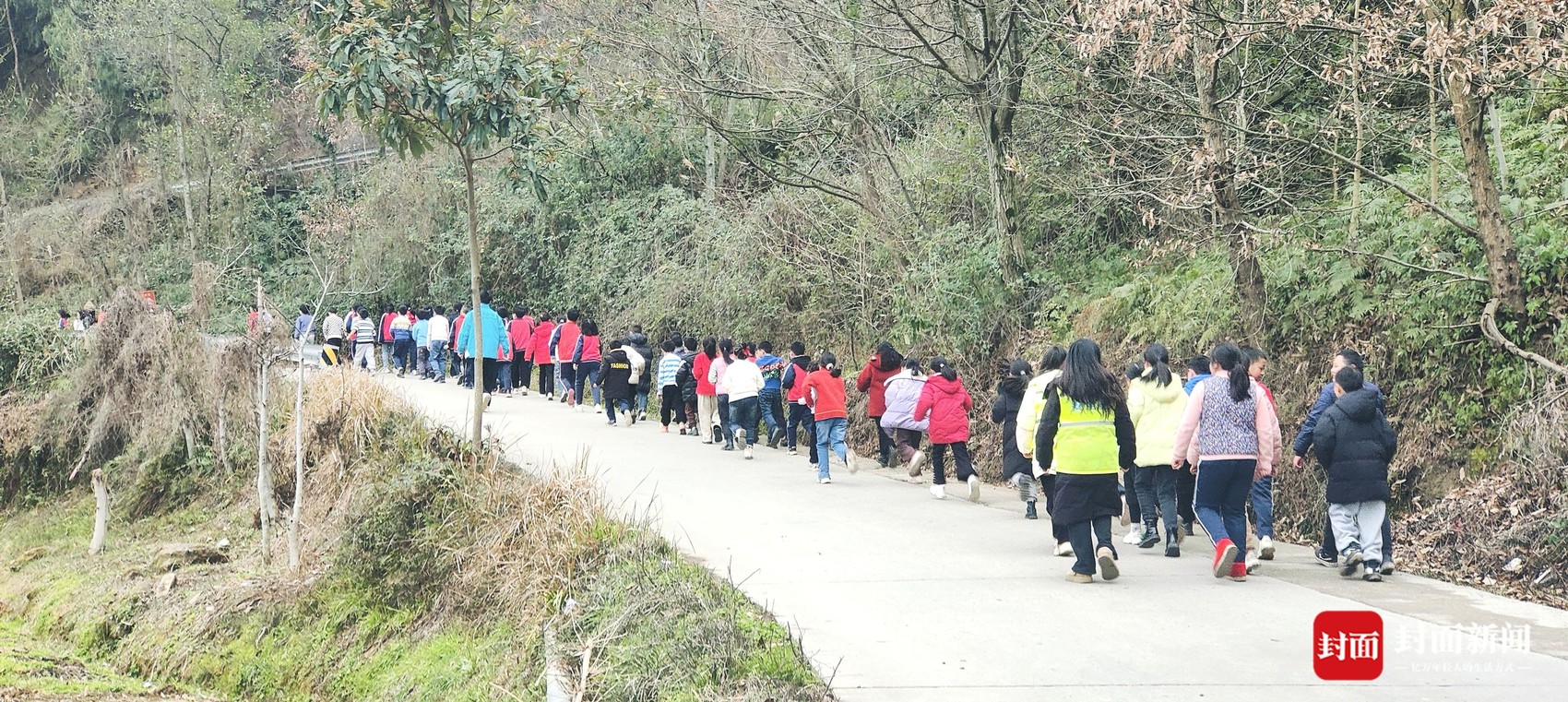 以学校为中心,方圆6公里的村庄都会接到学校的通知,告知学生拉练的时间段和奔跑路线。洛城寨村村支书杨柳,三宝山村支书王红,她们早年都毕业于望垭中心校,现在自己的儿女都在这所学校读书,在接受封面新闻采访时,她们都表示,乡亲们都相信和支持这所“家门口的好学校”,一遇上学校远距离奔跑训练,村民自觉调整作息时间,农机不上路,家禽不出门,最大限度减少对孩子们的影响。