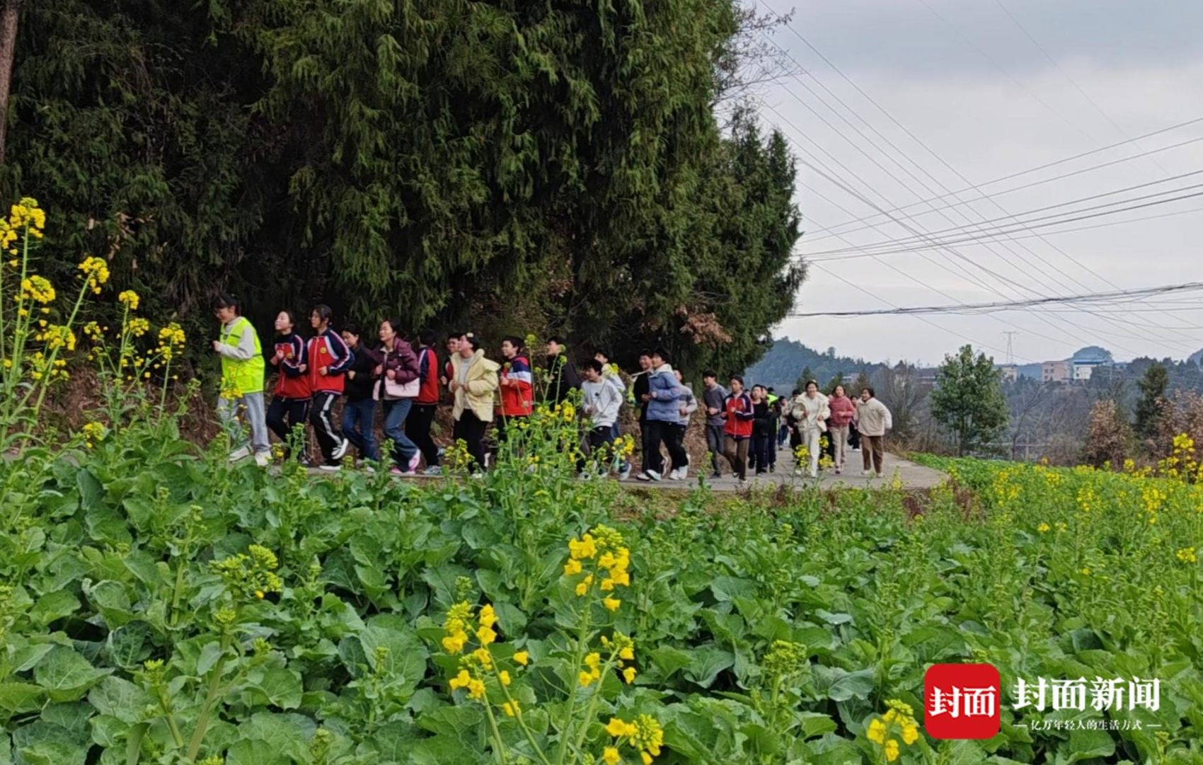 2月20日下午5时20分,3支队伍从学校前后门发,校长苟攀、学校副书记史浩霖都换上便装,各领一支队伍,吹着哨子,护送学生。一年级19名学生要往返要跑2公里;9年级52名学生要跑6公里。这些现成的乡村道路成了孩子们的“跑道”,封面新闻记者跟随其中两路一起奔跑。乡村水泥路崎岖不平,同学们没穿统一的校服,但都有一双合脚的运动鞋。