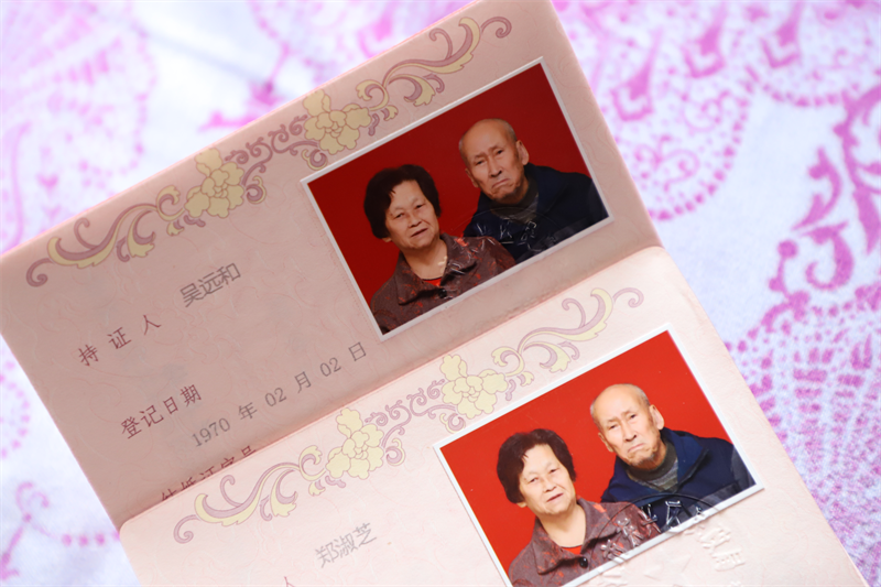 “他用拉船的钱在糖厂给我买了一件袄子,一片绿,花花的,哎哟,他不晓得啷子选。”郑淑芝说,“我们第一次见面,他穿着一块蓝色灯草绒布料做的衣服,上面的绒毛都磨没了,全是补丁。”说着,她从衣服口袋里掏出钥匙,打开了放在卧室角落的大柜子,取出装着她和丈夫结婚证的布袋:“以前的结婚证搬了很多次搬掉了,这是我们去年补办的结婚证。”