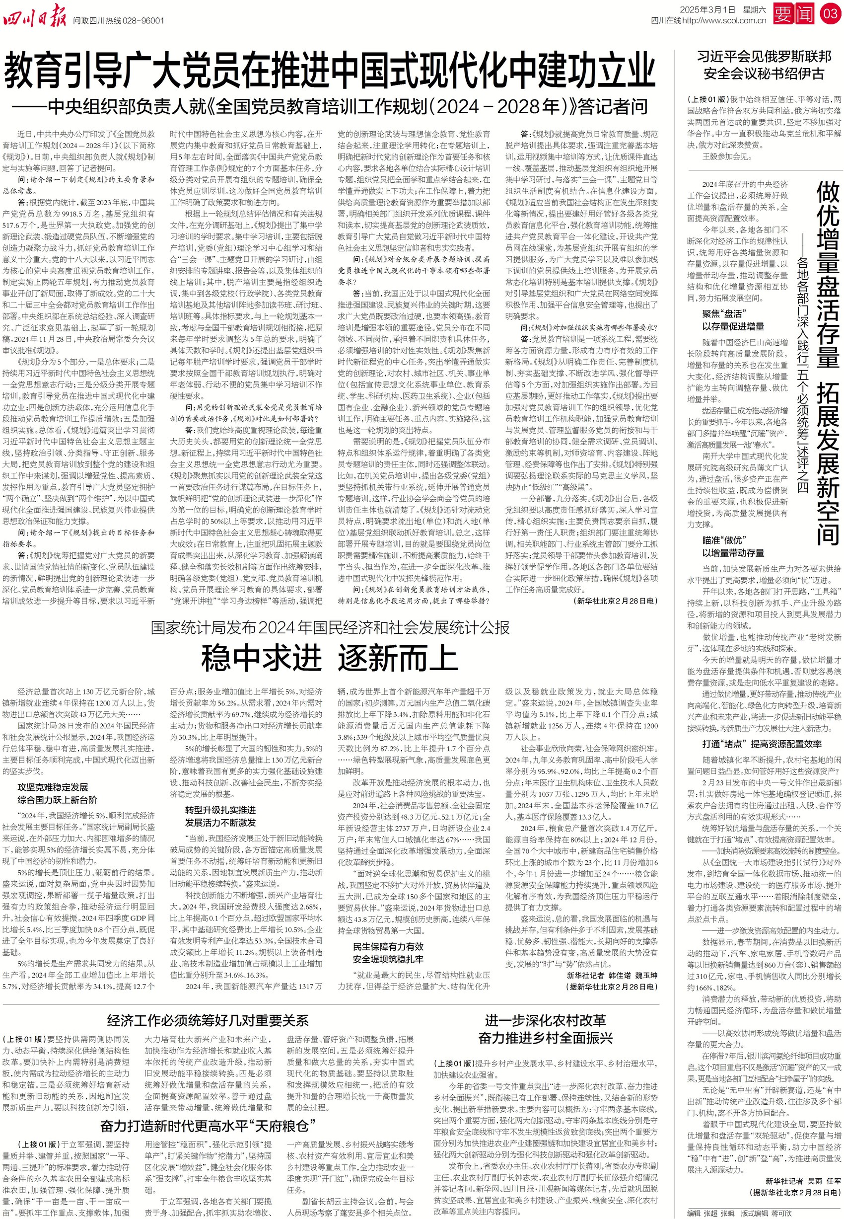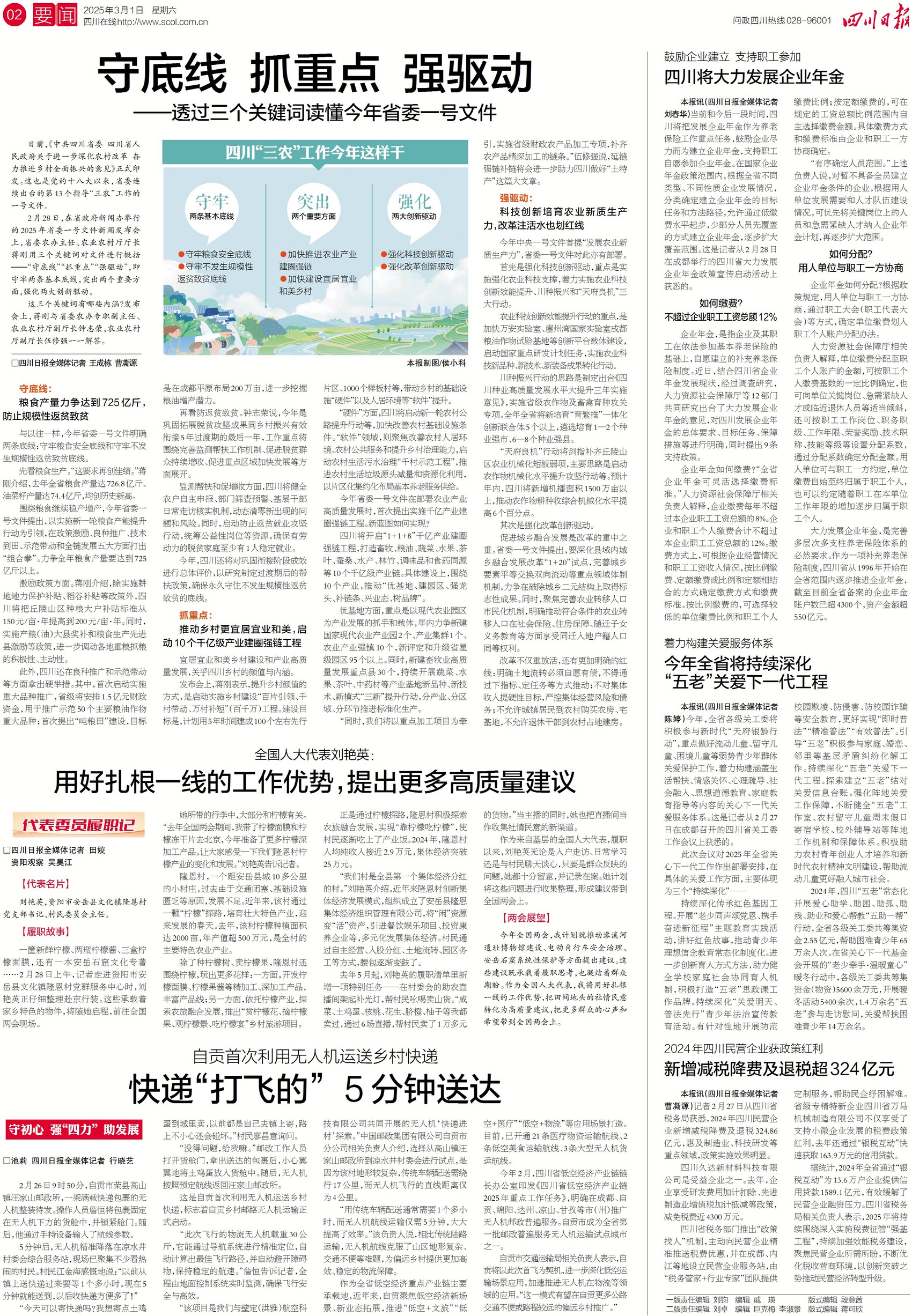近日,党的十八大以来,四川发布的第十三个指导“三农”工作的一号文件——《中共四川省委 四川省人民政府关于进一步深化农村改革 奋力推进乡村全面振兴的意见》正式印发。2月28日,在省政府新闻办举行的2025年省委一号文件新闻发布会上,相关负责人用“守底线”“抓重点”“强驱动”三个关键词对文件进行了概括。关注今日二版,解码三个关键词的具体内涵。