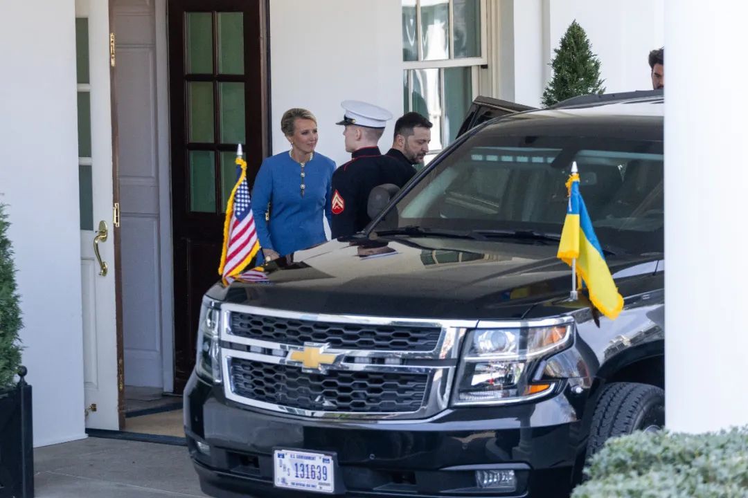 2月28日,乌克兰总统泽连斯基(左三)离开美国华盛顿白宫。新华社记者 胡友松 摄