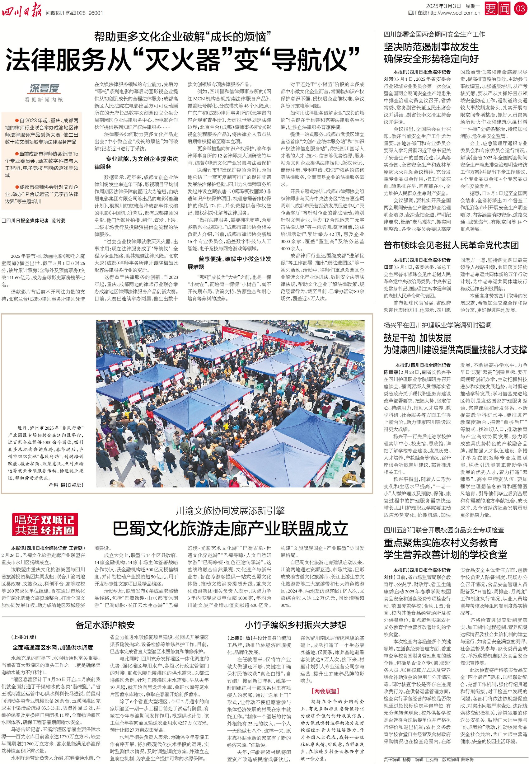 2025年春节档,“成都造”动画电影《哪吒之魔童闹海》横空出世,票房列全球第七。爆款影片的背后,是成都司法力量的鼎力支持:不断创新法律服务、构建和完善法律服务“生态圈”......近年来,成都文创企业法律纠纷发生率连年下降,影视项目平均制作周期因法律保障前置而大幅缩短,文化企业知识产权维权难等问题不断得到解决。今日3版,跟着法律服务“导航仪”,点亮“诗与远方”。