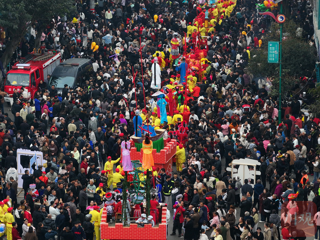 2025年3月1日,四川省宜宾市兴文县大坝苗族乡举办了以“文昌高照,非遗大坝”为主题的国家级非物质文化遗产“大坝高装”巡游活动。C视觉 曾朗 摄