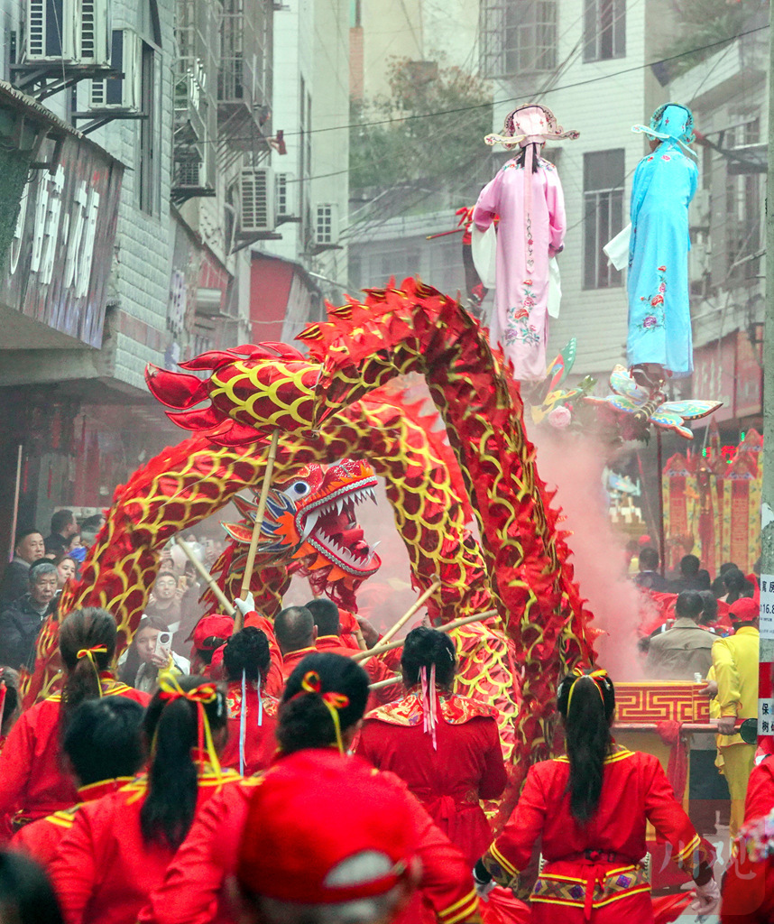 2025年3月1日,四川省宜宾市兴文县大坝苗族乡举办了以“文昌高照,非遗大坝”为主题的国家级非物质文化遗产“大坝高装”巡游活动。C视觉 邓显杰 摄