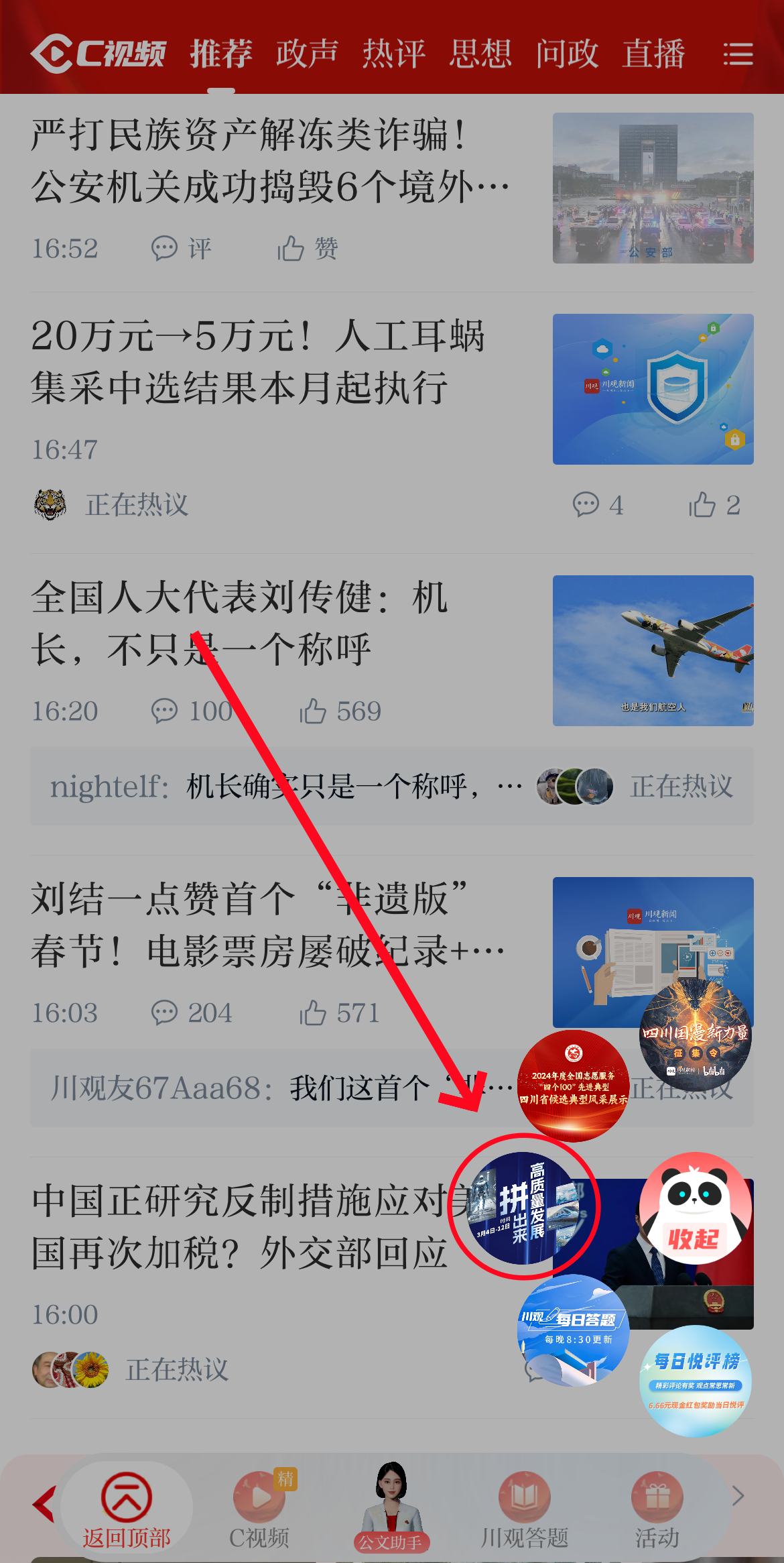 方式一:在川观新闻首页,点击右下方悬浮球,找到“高质量发展‘拼’出来”活动图片点击参与;