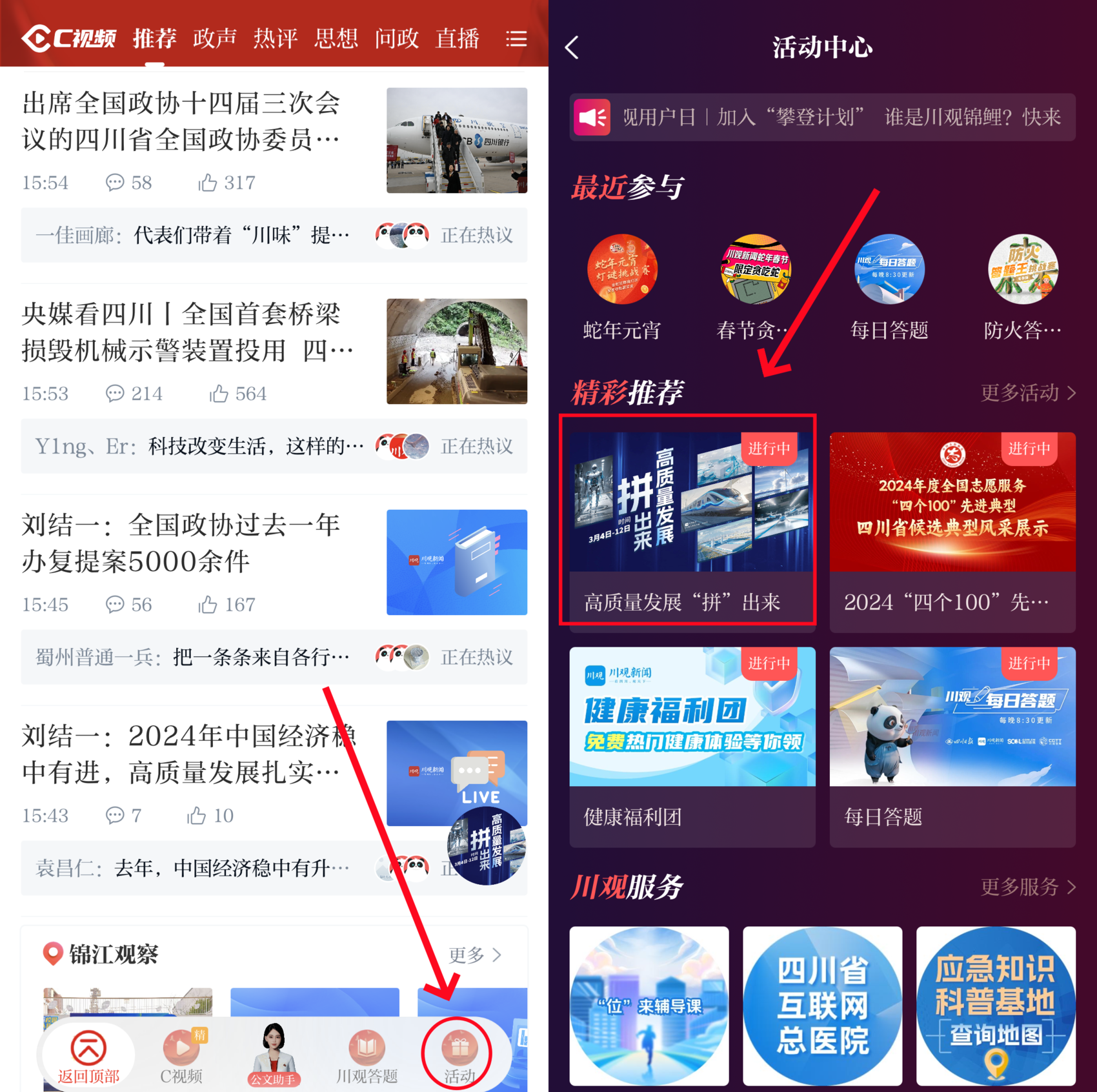 方式二:在川观新闻首页,点击右下角“活动”,进入到“活动中心”,找到“高质量发展‘拼’出来”活动图片点击参与。