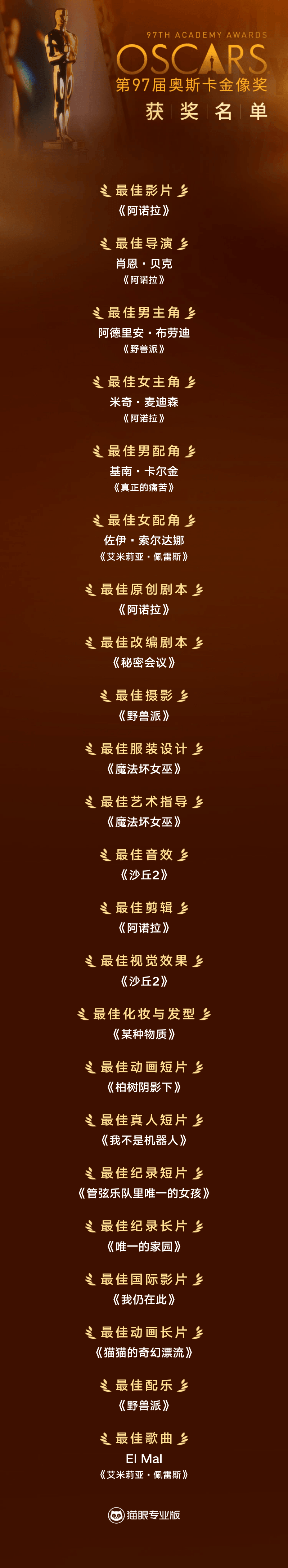 北京时间3月3日,第97届奥斯卡金像奖颁奖典礼在美国加利福尼亚州洛杉矶杜比剧院举行。最终,电影《阿诺拉》拿下最佳影片、导演、女主角、原创剧本四项大奖,成为最大赢家。