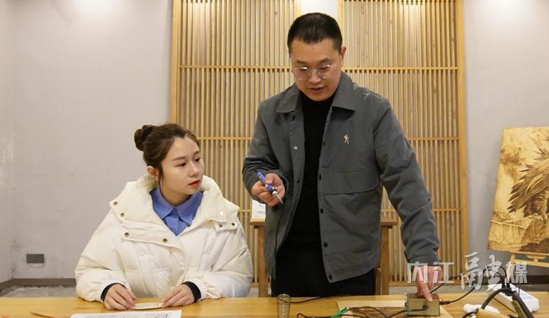 王全(右)讲解烙画技巧