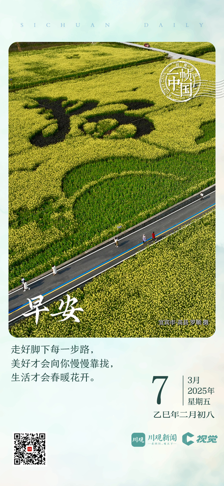 俯瞰连片油菜花,一个大写的“春”字印在大地的心头,也闯入我们的眼帘。只有用心走好每一步,生活才会是一场春暖花开的芳香之旅。一起徜徉金色花海,尽享美好春光吧。