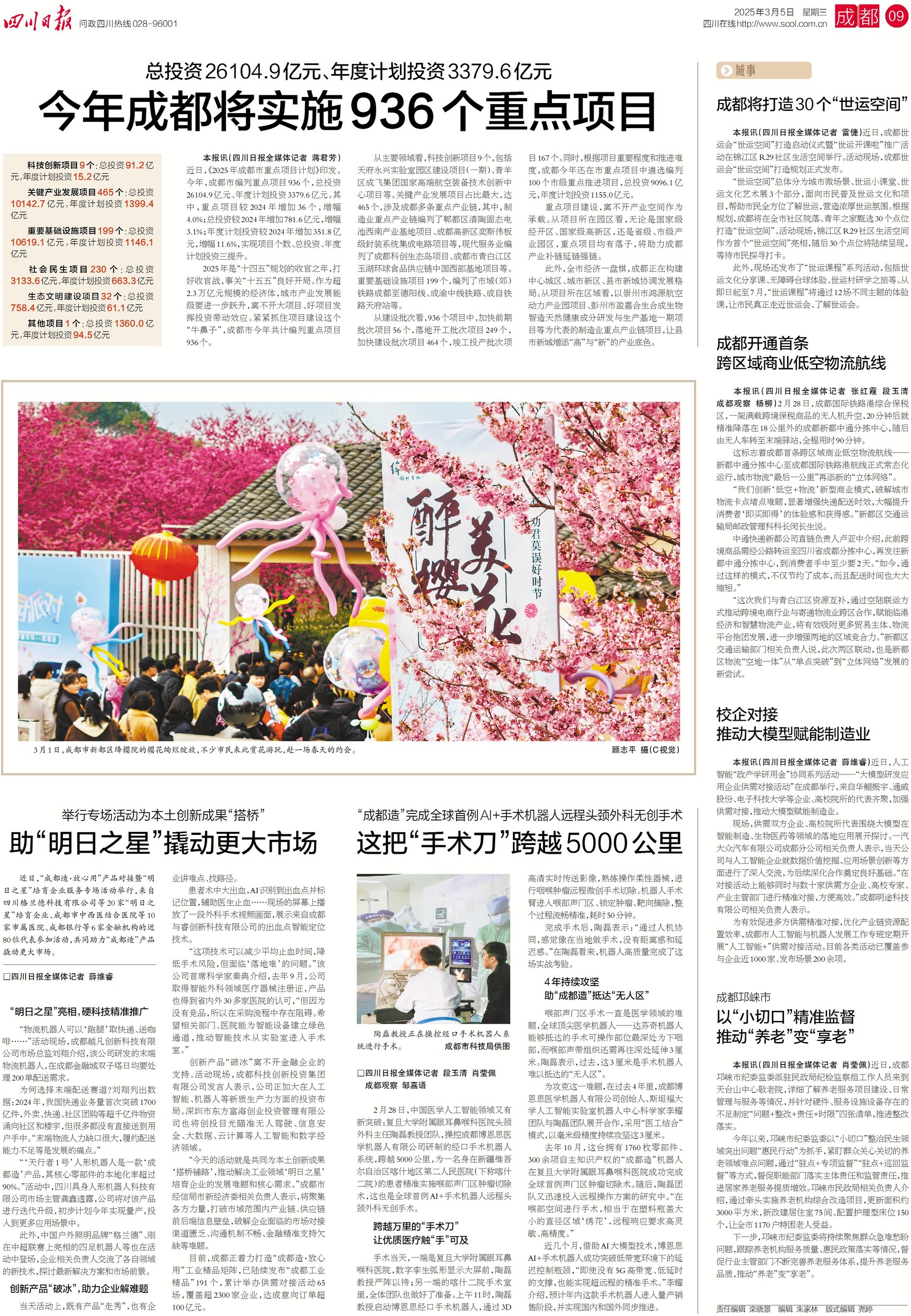 近日,《2025年成都市重点项目计划》印发。作为超2.3万亿元规模的经济体,成都今年编列重点项目936个,总投资26104.9亿元、年度计划投资3379.6亿元,实现项目个数、总投资、年度计划投资三提升。今日九版,了解更多成都重点项目详情。