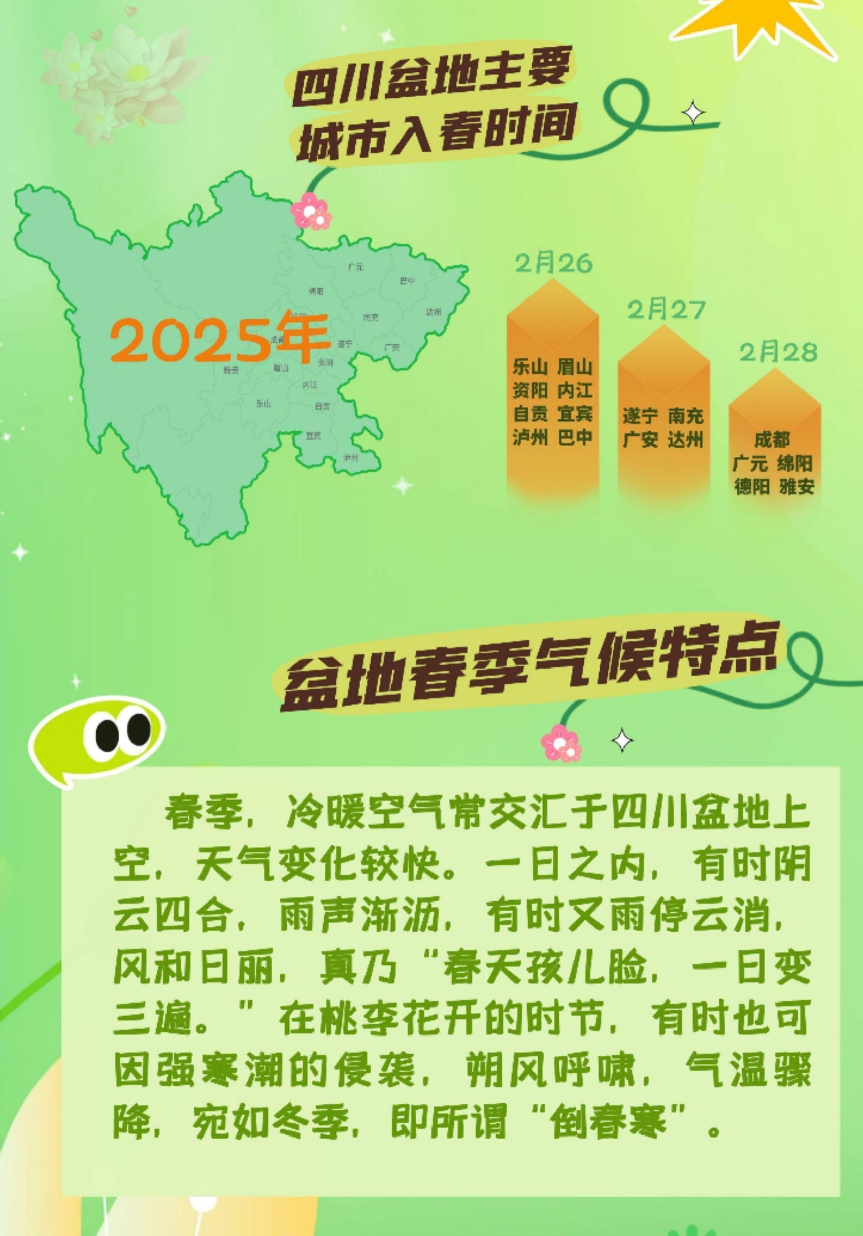 其实,就在昨天傍晚,@四川气象发布了一条好消息:2月26日至28日,四川盆地主要城市都陆续入春!