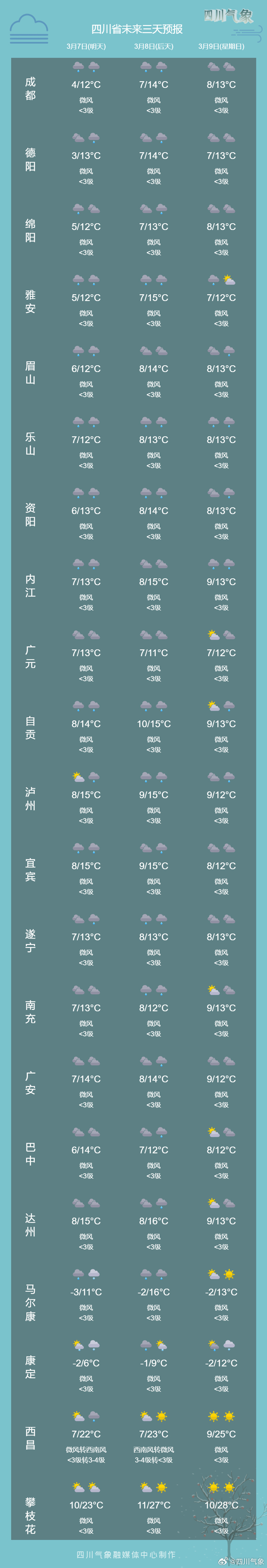 ★ 四川省气象台今天早间发布天气预报,未来三天,盆地大部地方阴天有小雨;阿坝州大部、甘孜州北部东部和凉山州东北部多阵雪(雨),局部有大到暴雪,需防范雨雪天气和道路结冰对交通运输带来的不利影响;甘孜州南部和攀西地区西部大部时段多云天气为主,森林火险气象风险等级较高,需加强火源管理和森林防火工作。