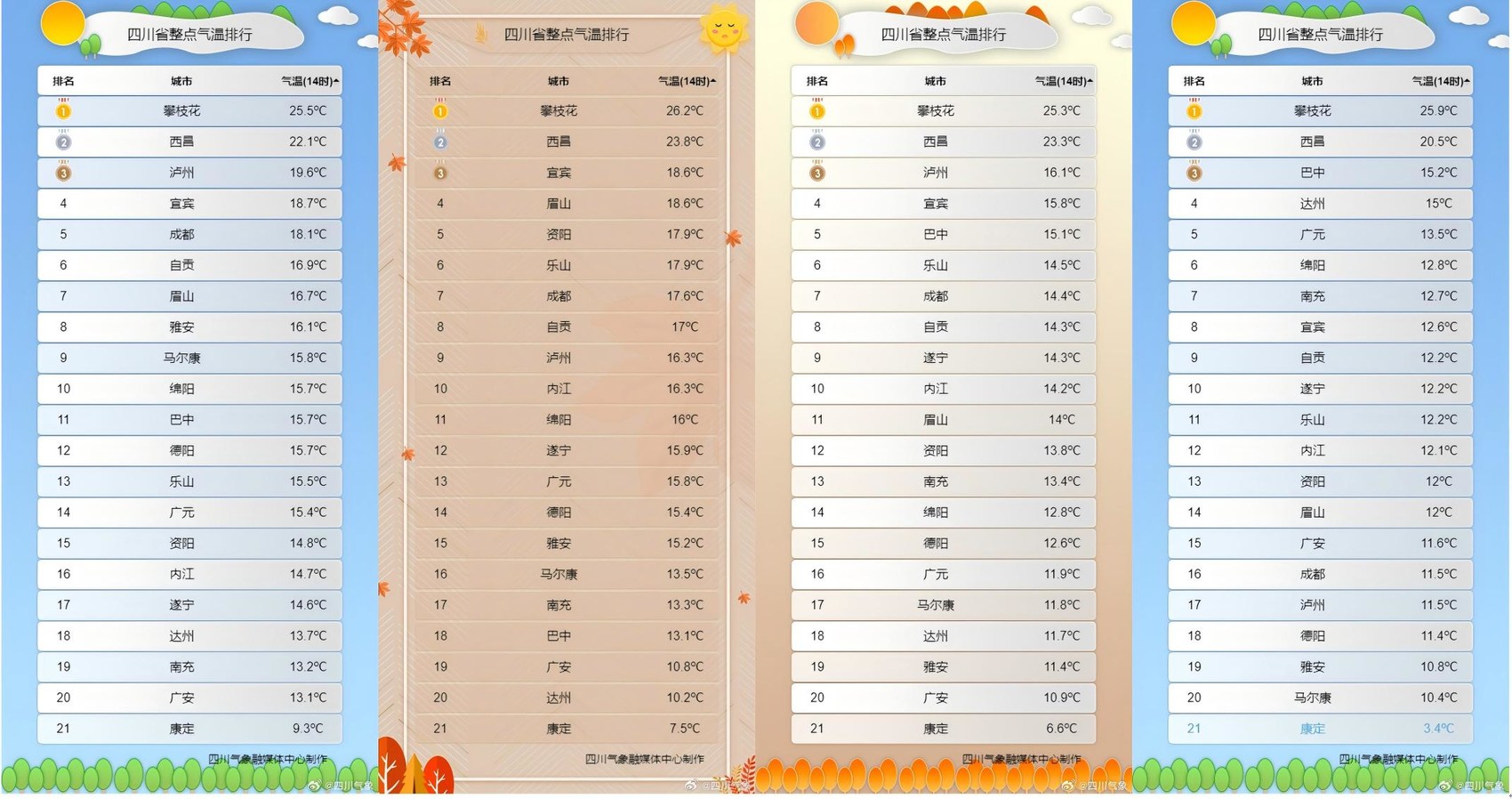 从左至右依次为3月2日至5日14时四川各城市实况气温。来源:@四川气象