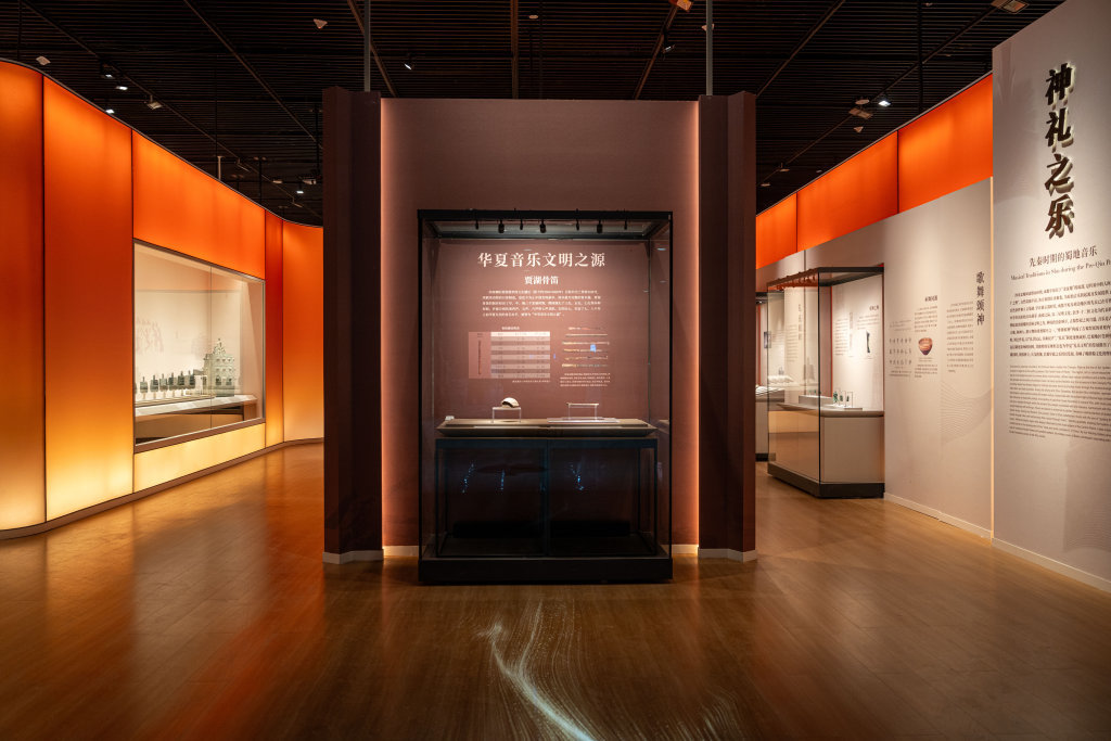 展厅入口处,观众第一眼看到的展品便是被誉为“中华第一笛”的贾湖骨笛。1975年夏天,河南舞阳贾湖裴礼岗文化遗址出土近30支骨笛。经鉴定,这些乐器全部是由鹤类尺骨制成,是迄今为止中国发现最早、保存最为完整的管乐器。此次展览执行策展人张宝琳介绍,虽历经久远,眼前的这件七孔骨笛展品犹可吹奏出完整的下徵调七声音阶。“它是远去的仙鹤留在世间的清鸣,也是我们的祖先,以音律为信敬畏自然、歌咏生活的见证。”