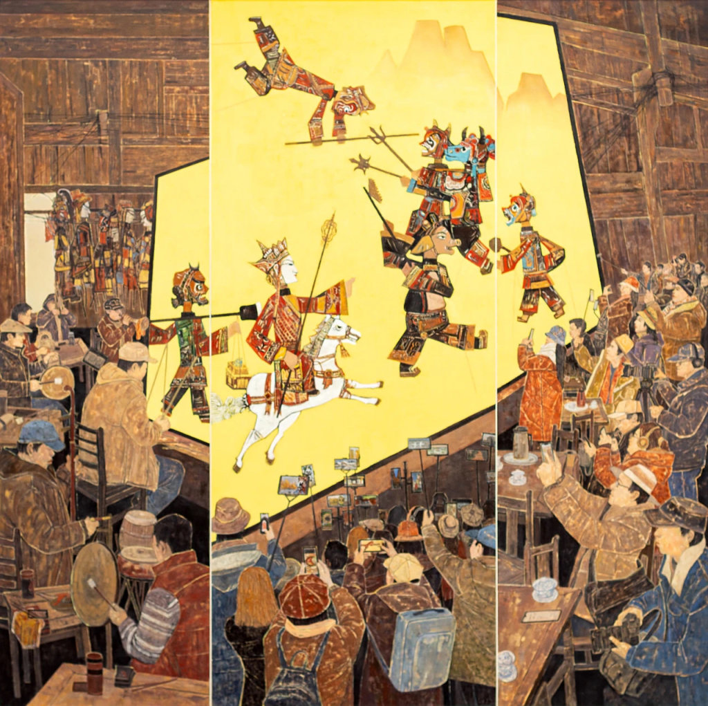 著名画家李猛秉持东方审美意识,致力于用西方绘画技法表现中华文化题材,成为一位中西绘画艺术融合、革新和发展的探索者。在他看来,大多数情况下,只有“被设计的美”才符合人们的审美需求,设计之美已经渗透于我们生活的方方面面,延伸到现代社会的点点滴滴,其绘画创作同样饱含着独出机杼的设计意识。这幅《灯影舞华章》入选2024四川省美术作品展和第十四届全国美展,作品构思精巧,以三段式、模块化的构图和布局,将皮影戏演出台前幕后的不同空间展现在同一画面上,皮影角色、民间艺人、现场观众形成一个有机整体,而又不给观者违和之感。