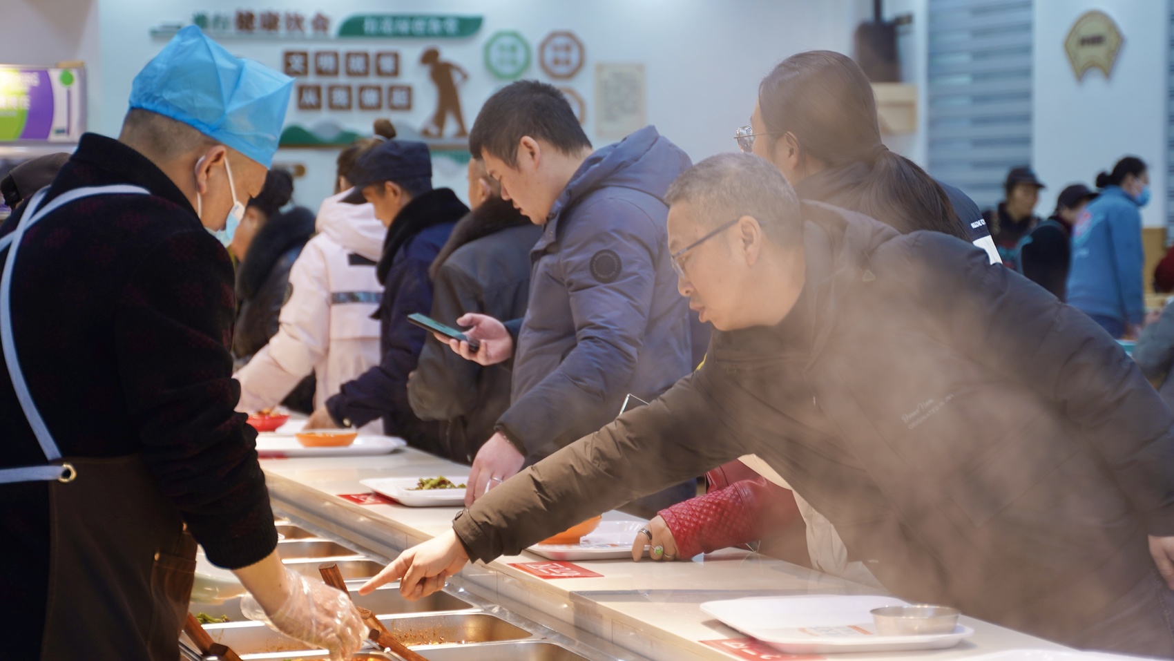 3月6日,岳城社区食堂内排队选餐的人络绎不绝,烟火气十足。胡力文 摄