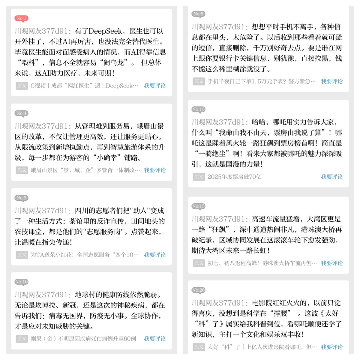 (@川观网友377d91每日悦评榜部分上榜评论)