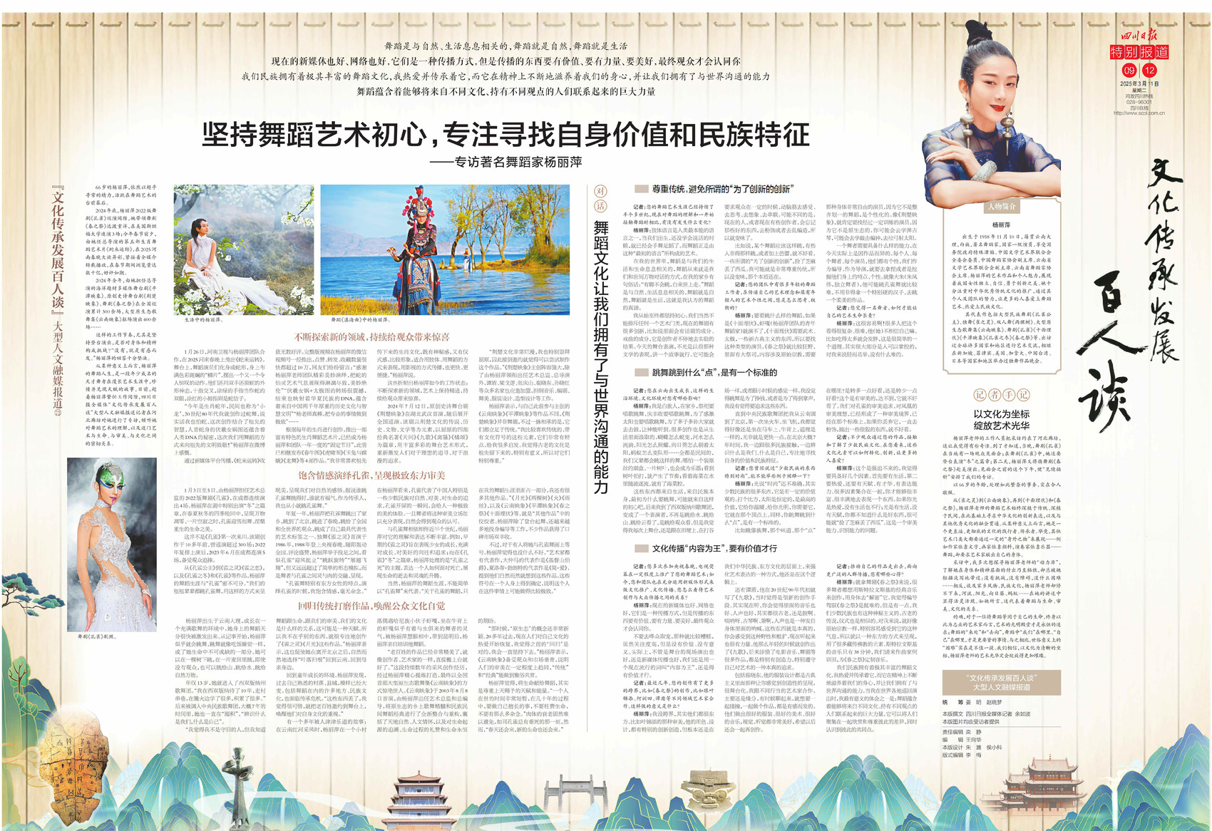 四川日报全媒体“文化传承发展百人谈”大型人文融媒报道持续推出,今日《四川日报》连版推出第七十三期,专访著名舞蹈家杨丽萍。