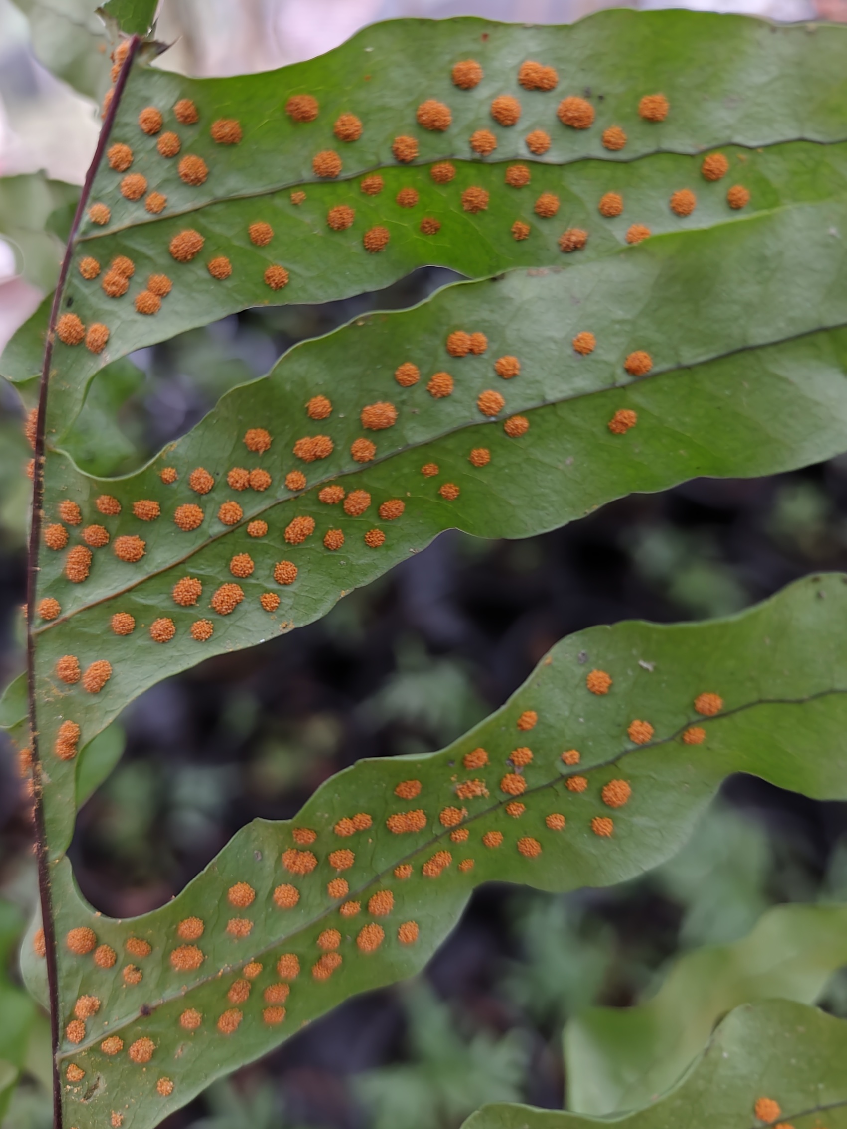 叶背,一团团黄色的物质为骨碎补的孢子(相当于种子)。