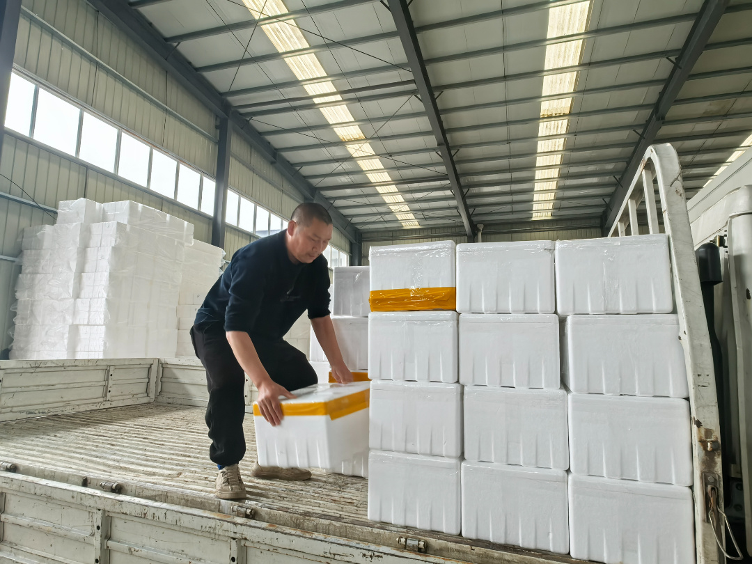包装好的黄颡鱼鱼种装车发往快递公司。