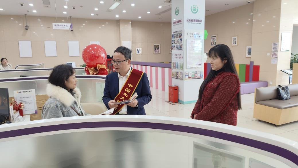 光大银行成都分行各支行网点,一场场别开生面的“金融知识小课堂”正热闹开场。厅堂内,宣传展板围绕非法集资、个人信息保护等内容有序摆放,色彩鲜艳的画面与简洁的文字吸引客户驻足阅读;网点咨询台被精心布置成知识宣讲站,工作人员热情迎接每一位到访客户。在客户等待办理业务时,工作人员利用碎片化时间,主动上前发放宣传折页,宣讲防范金融风险知识,并结合真实案例,深入浅出地讲解电信诈骗的常见手段,比如伪装公检法要求转账、网络交友诱导投资等,提醒客户守住“钱袋子”。让客户在轻松氛围中了解金融风险防范要点,把银行厅堂变成普及金融知识的前沿阵地 。