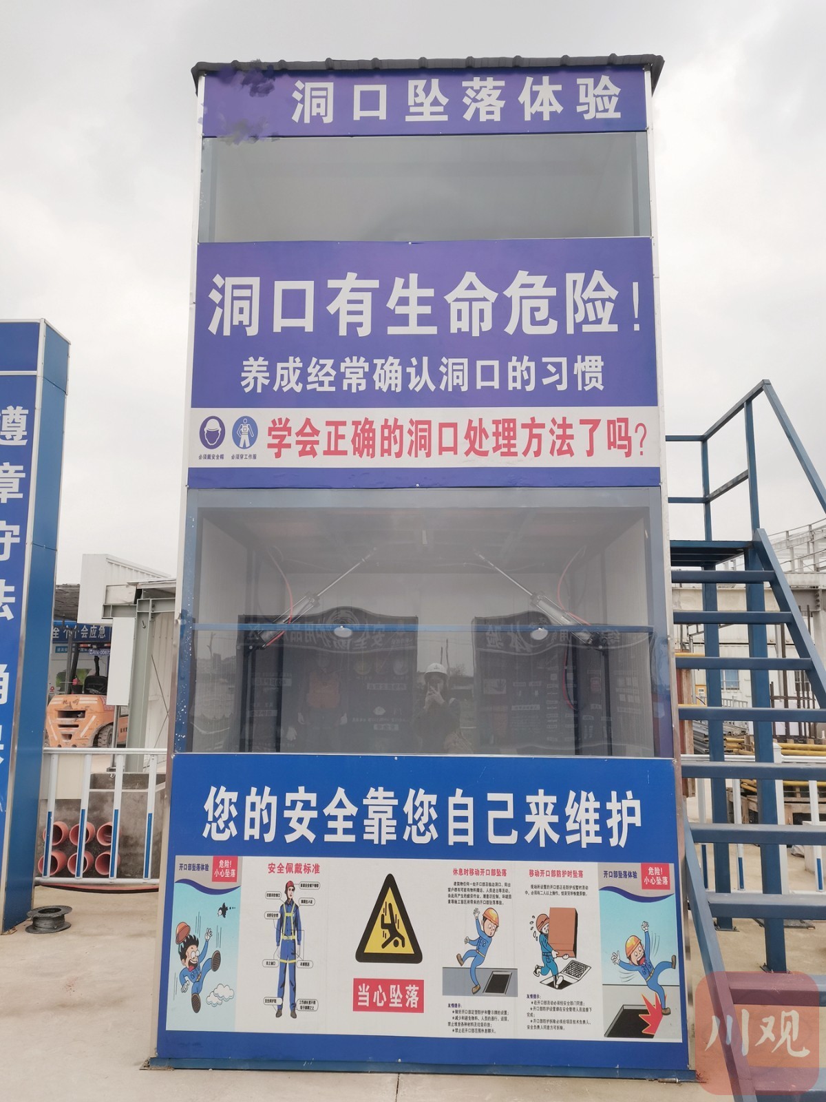 在项目施工现场,川观新闻记者看到,作业面均有安全员在进行巡查,现场也有喇叭在时刻提醒“高空作业、注意安全”。视频拍摄区域并不是工地门口,而是工地内部一处名为“安全教育培训体验馆”的场所,体验馆内部包括安全急救培训体验、安全帽撞击体验、安全带使用体验、灭火器演示体验、综合用电体验、安全教育宣讲台、洞口坠落体验等。