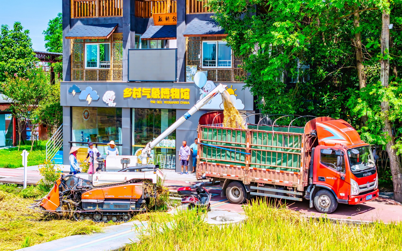 乡村气象博物馆旁,水稻收获忙。张志强 摄
