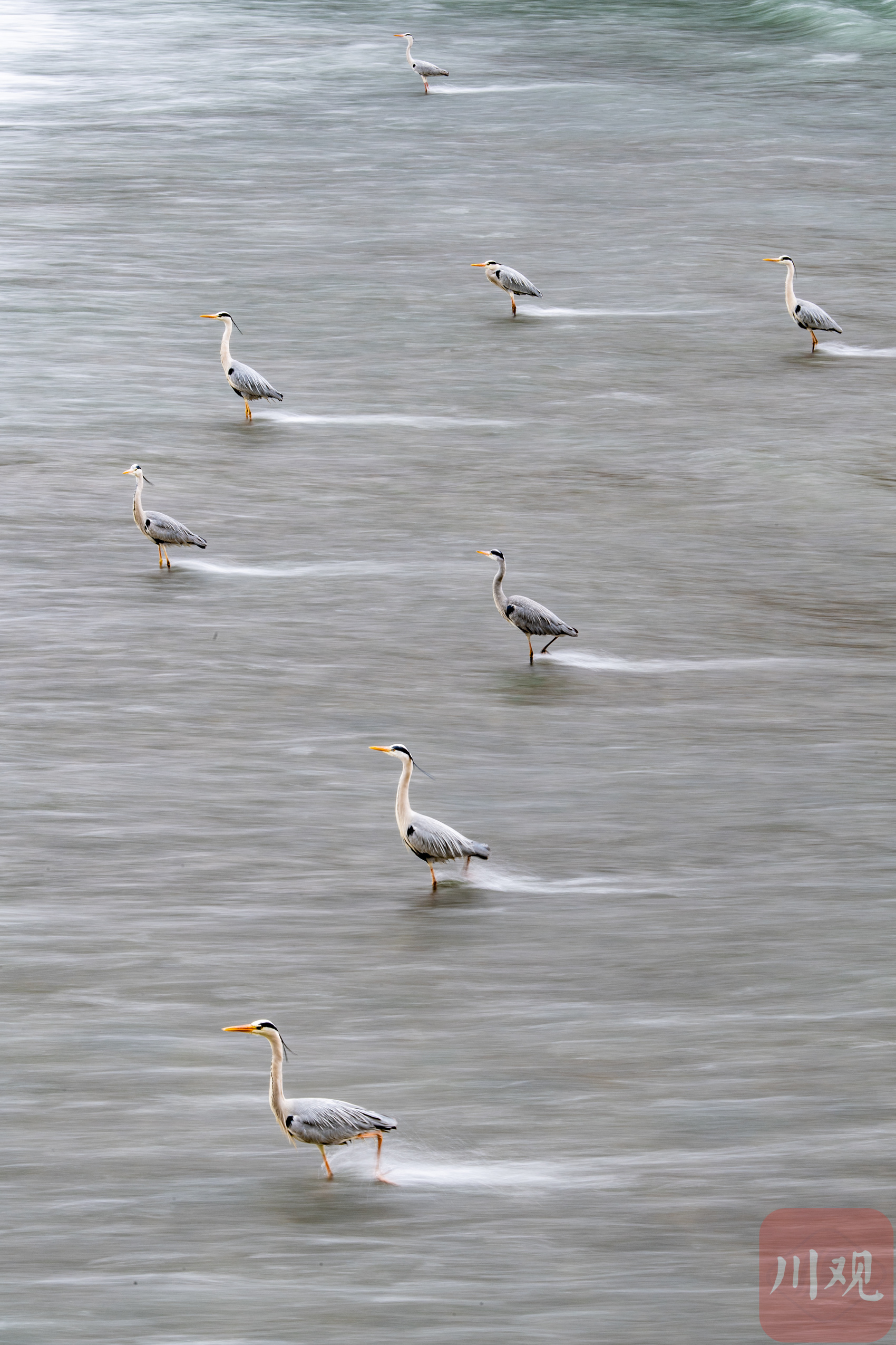 近日,成都九眼桥栖息的鹭鸟在江水中整齐站立的照片引发关注。记者3月13日在该地点看到,十几只鹭鸟站在浅滩处整齐地目视上游方向,单腿站立,奇特的景象引得不少市民驻足观看。