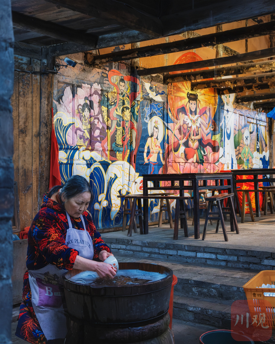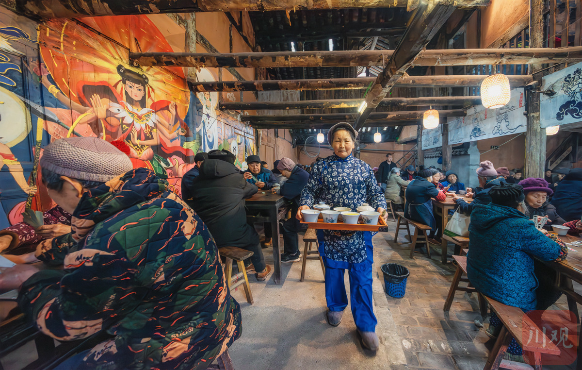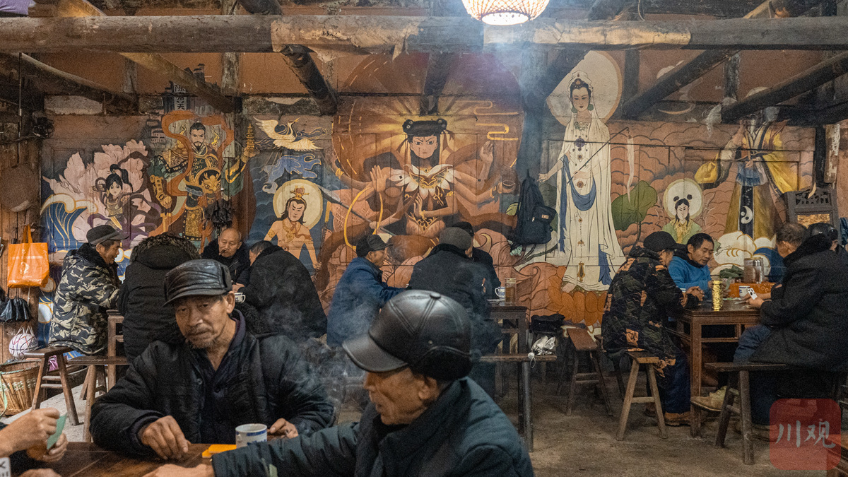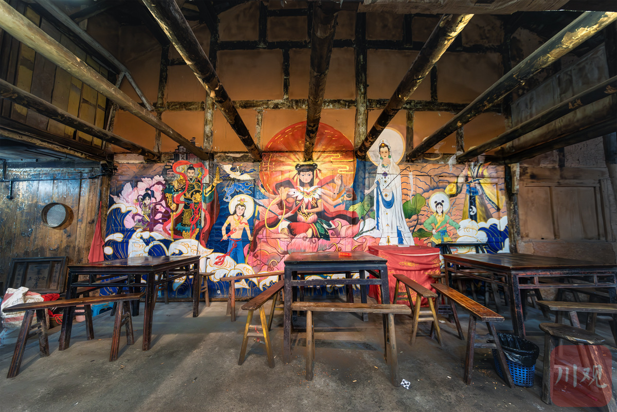 步入茶馆,立刻会被绘制在各面墙壁上的哪吒彩绘吸引注意力。从灵珠转世到哪吒闹海,再到莲藕重生,哪吒的成长历程徐徐展开。这些画作色彩鲜艳、生动活泼,与极具川南地区特色的建筑碰撞出奇妙的艺术风格。