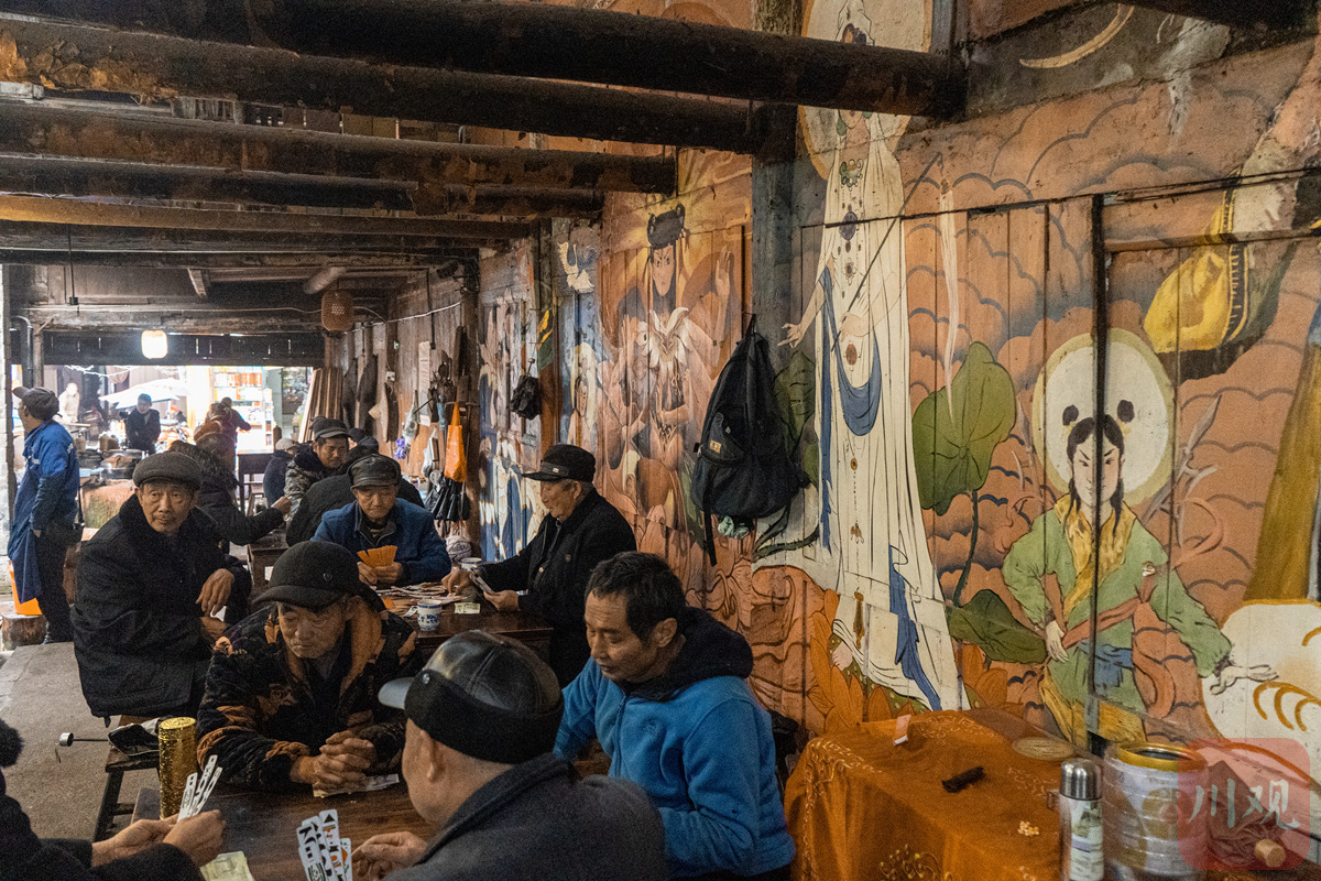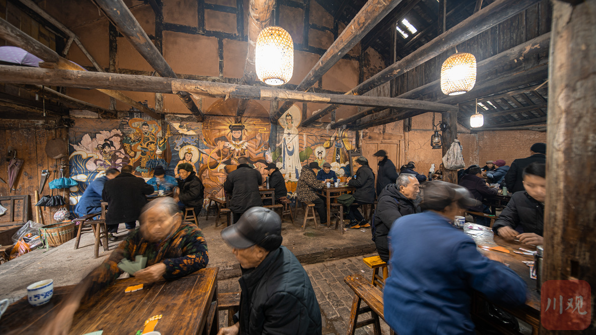 茶馆内宾朋满座,座无虚席,大多是泥溪本地的邻里熟客。茶客们悠闲地喝茶、摆龙门阵、打长牌,老板和伙计穿梭其间,为茶客添水送茶。