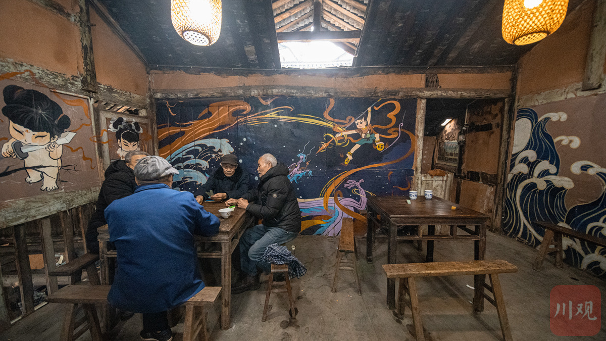 据茶馆老板介绍,2020年,宜宾洪峰过境,将当时的老年协会茶园淹了一半,受损严重。他便租下这间房加固修缮,重新开张,并请人绘制哪吒墙绘。“传说哪吒能让龙王退海万里,画上它,洪水就不敢再来了。”老板笑言。