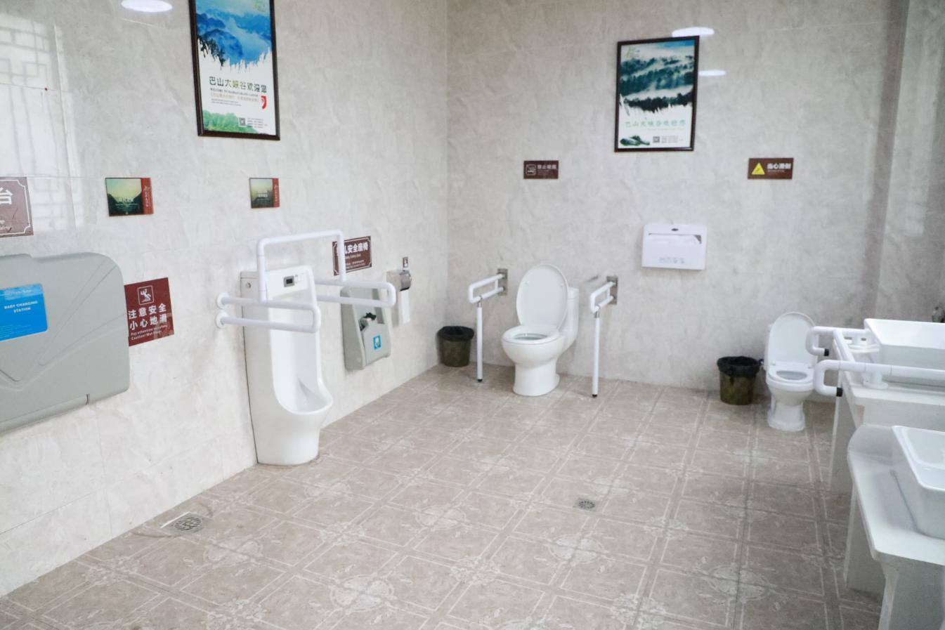 为进一步完善巴山大峡谷景区游客接待中心的各项功能,缓解游客排队如厕压力,提升旅游体验,宣汉县对巴山大峡谷景区客运站旅游厕所进行改造提升。在改造过程中严格按照《旅游厕所质量要求与评定》国家标准规划,配套有男厕、女厕、第三卫生间和工具间、管理间,合计厕位73个(含无障碍厕位4个),洗手盆12个,面镜3张。每个厕位内均设有双挂衣钩、双纸巾架、搁物台;家庭卫生间按国家规范标准设置了专用扶手、儿童座椅、多功能护理台和紧急呼叫器,能满足不同人群的各种需求。同时设有人脸识别机、自动皂液机、自动喷香机等智能设备和旅游文化展示柜,功能齐全,使用方便。该厕全部采用泡沫封堵免水冲微生物降解技术,对厕所排污进行无害化处理,实现了旅游公厕零污染、零排放、无异味,酷寒零下40度至酷暑50度高温均可正常使用。同时加强对公厕硬件设施建设,突出公厕节水、节能、环保、人性化的理念,采用了节水、节能的洁具,在厕内配置檀香,减少了资源浪费的同时也确保了公厕内无明显异味。