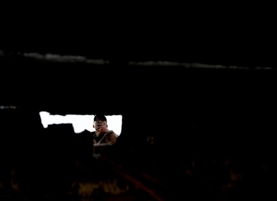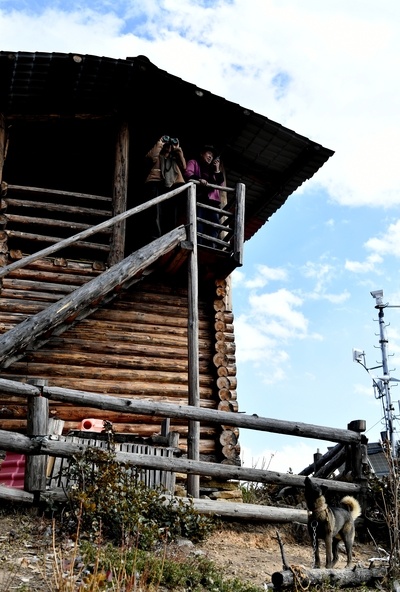 在海拔3760米的克尔乡大岩洞瞭望哨,撒里扎西次尔和队友正通过望远镜“扫描”茫茫林海,瞭望哨下的狗是他们最亲密的伙伴。