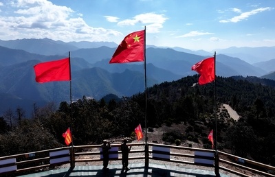 木里森林草原防灭火进入森林火险红色预警状态,红色预警旗飘扬在李子坪乡波拐瞭望台。