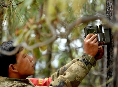 驻防队员定期前往林区更换红外线监控相机电池和收集数据内存卡。
