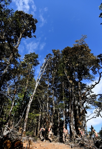 李子坪乡波拐前置驻守点驻防队员在茂密的林区巡逻。