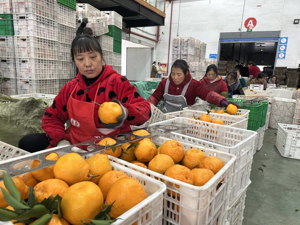 菜鸟农业产地加工中心里,工作人员正在分选耙耙柑。刘佳 摄