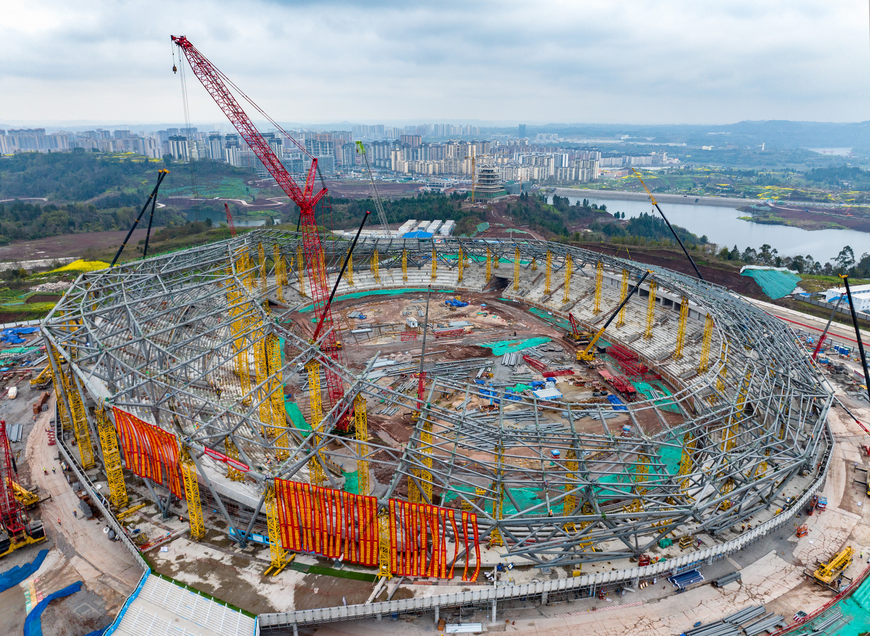 从高空俯瞰,此次合龙的体育场整体宛如一个“钢铁巨碗”,数百根钢筋纵横交错,体育场屋盖为悬挑式空间管桁架结构,36榀径向桁架通过环梁相互连接,整体呈椭圆形环带状,造型流畅灵动。
