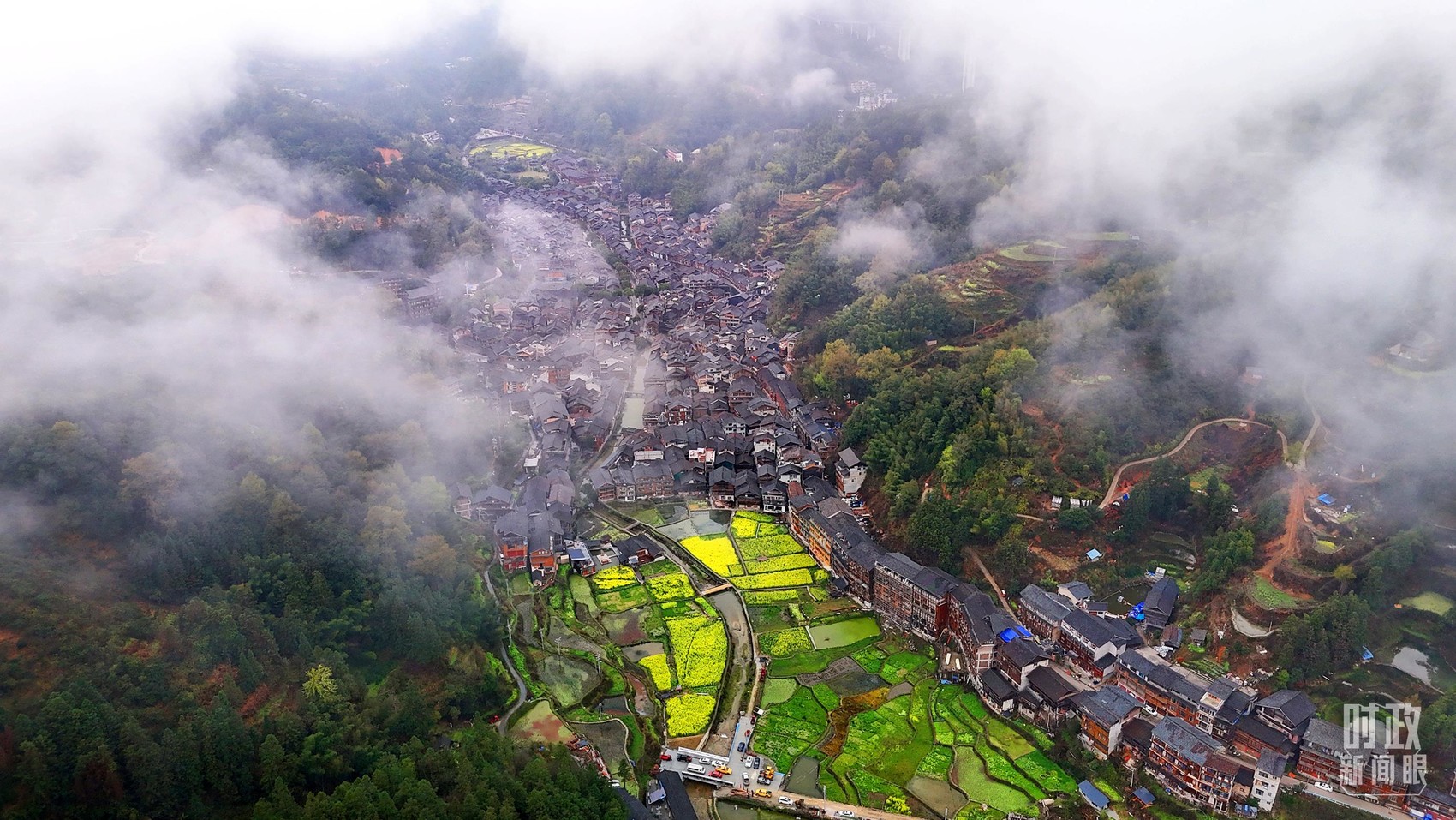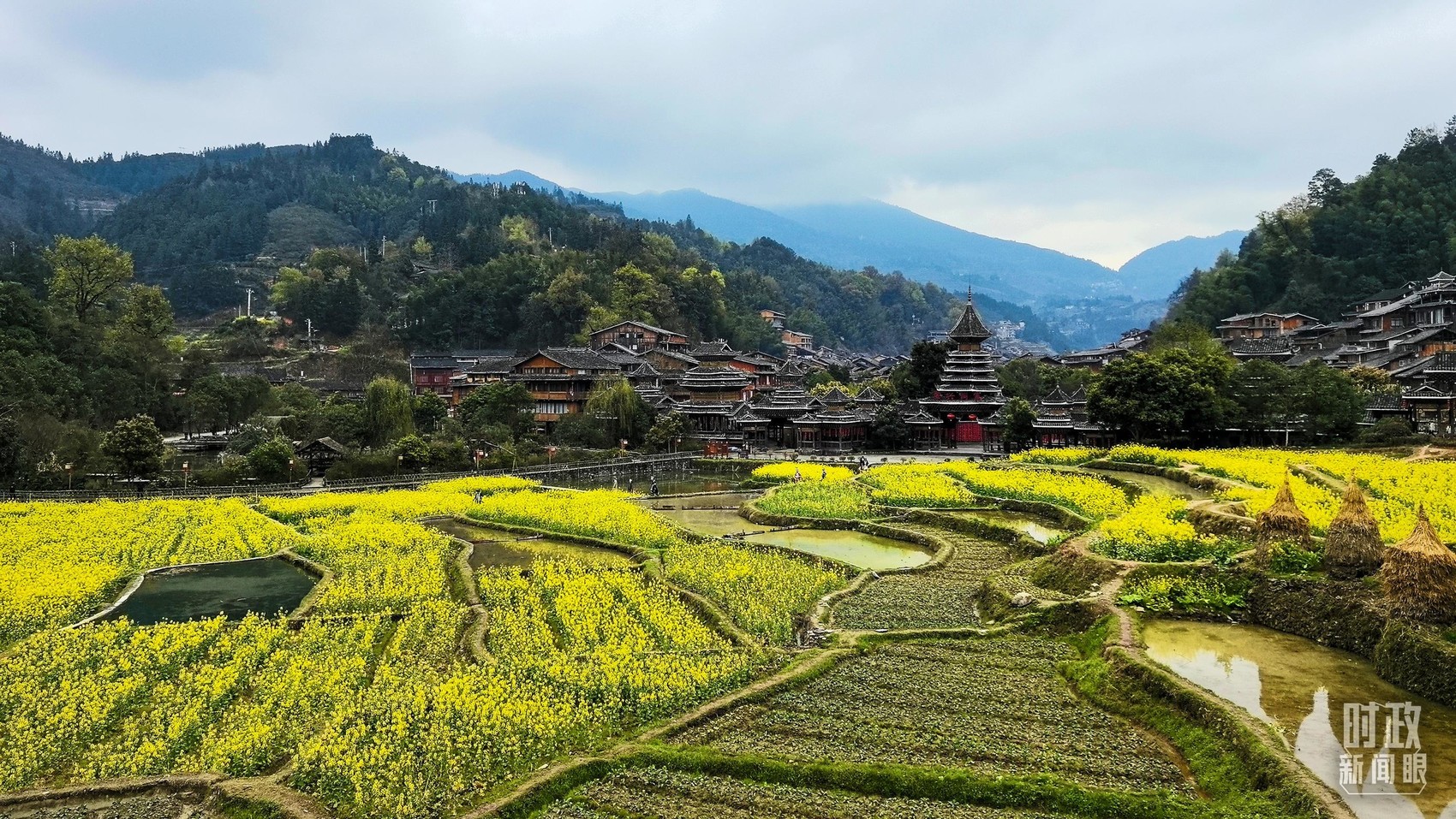 △春日的肇兴侗寨,油菜花竞相绽放。(总台央视记者程铖拍摄)