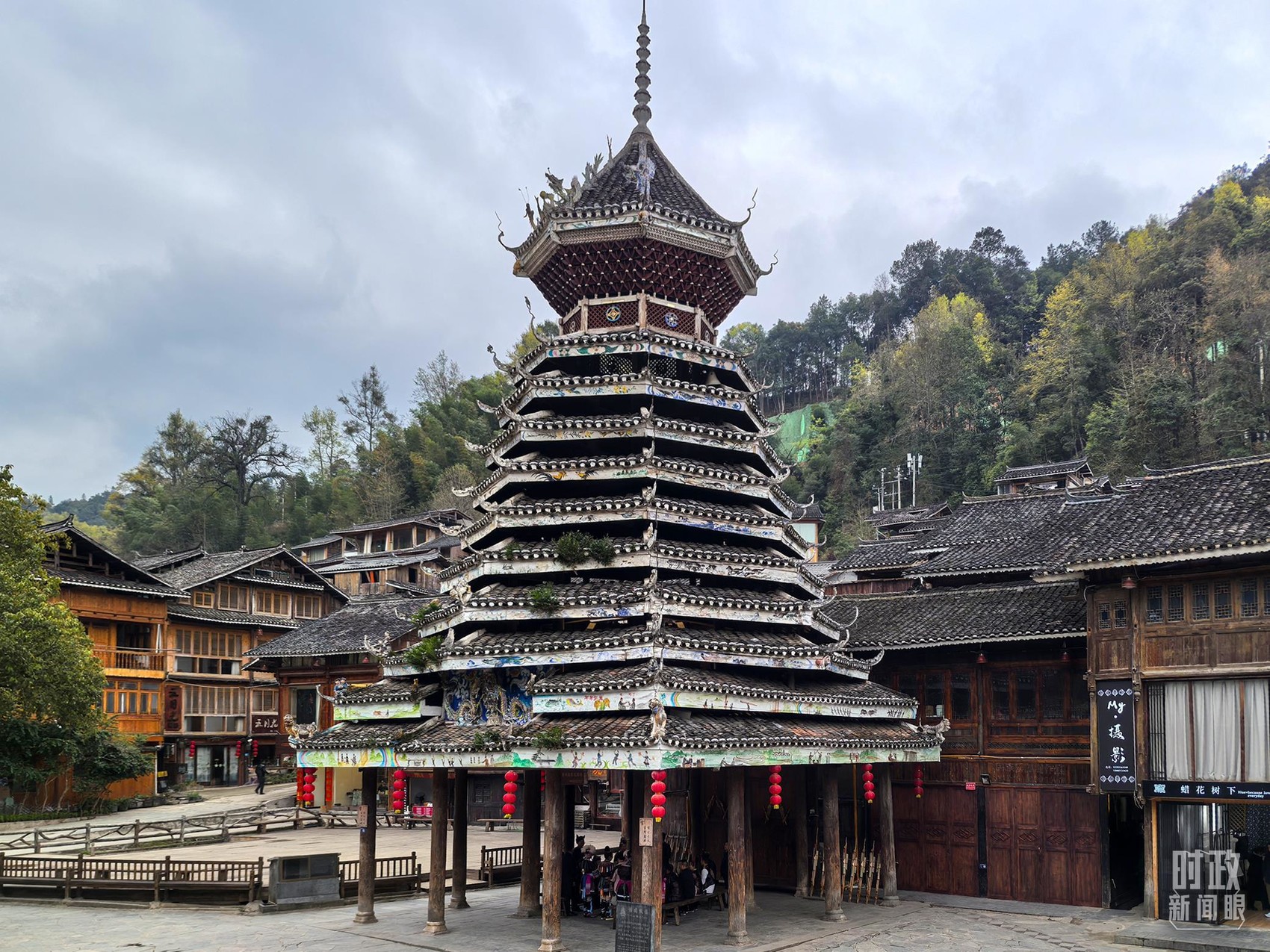 △肇兴侗寨以鼓楼群最为著名,五座鼓楼分别取名“仁团鼓楼”“义团鼓楼”“礼团鼓楼”“智团鼓楼”“信团鼓楼”。图中为信团鼓楼。(总台央视记者陆泓宇拍摄)