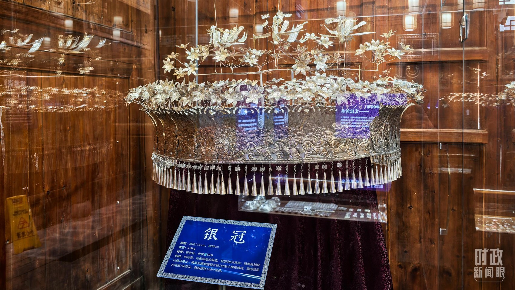 △银饰是侗族妇女的重要装饰。图为展示中心内的银冠。(总台央视记者鄂介甫拍摄)