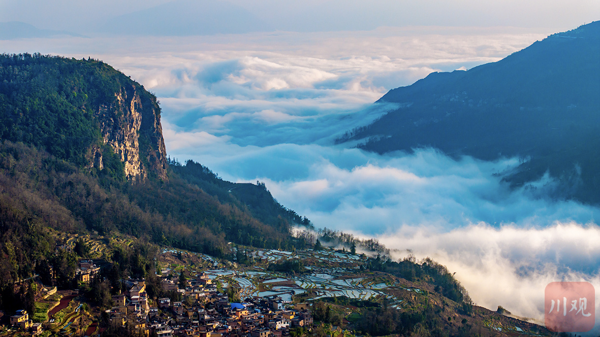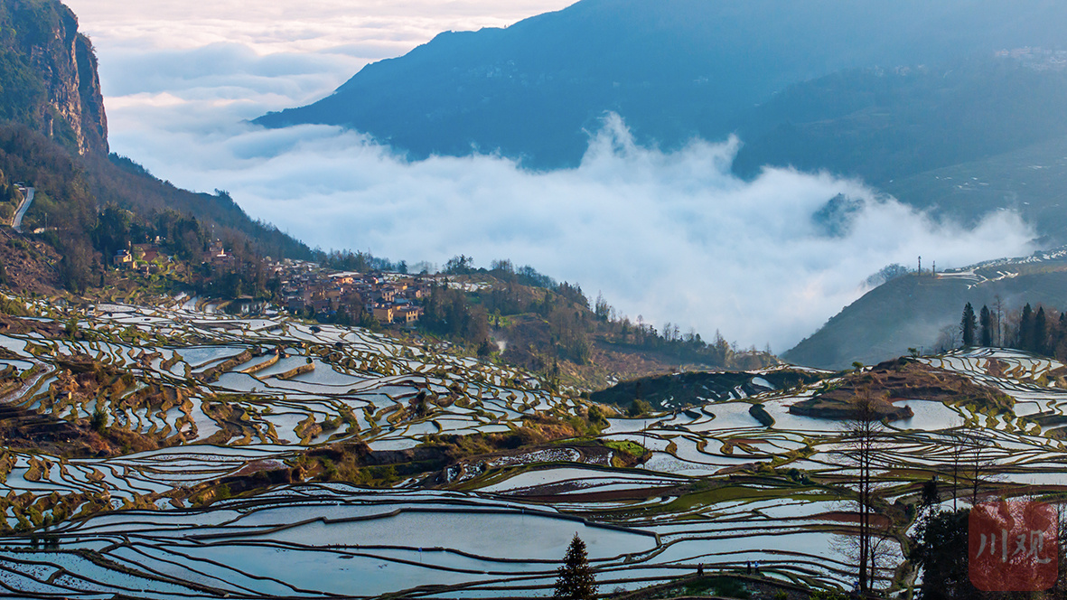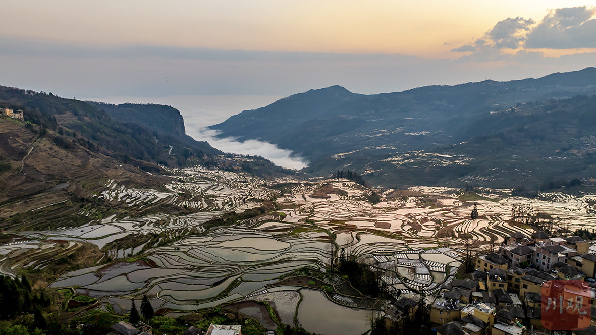 头年2月底至当年3月初,梯田灌水后形成“水镜”,云海相伴,光线柔和且色彩层次丰富。