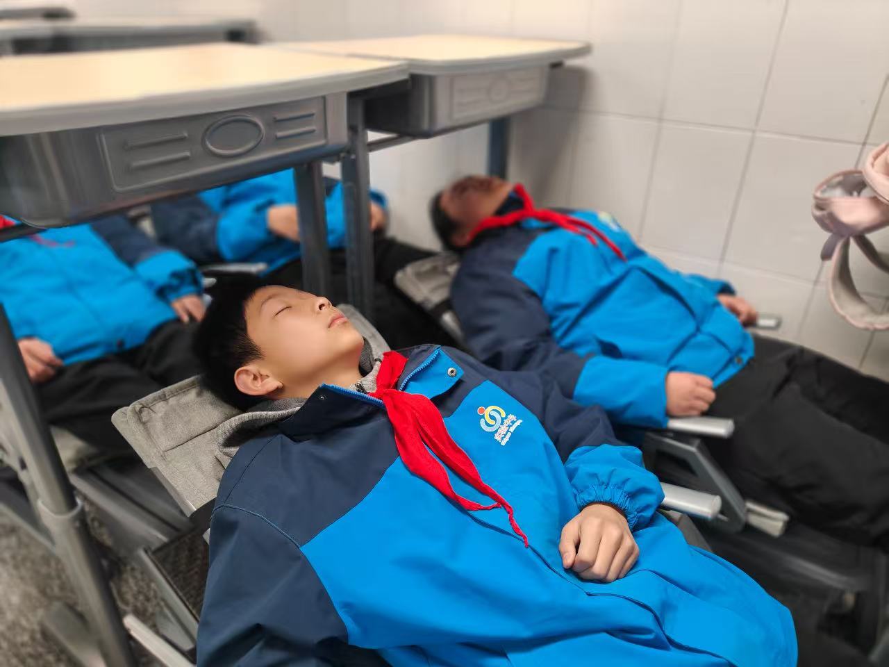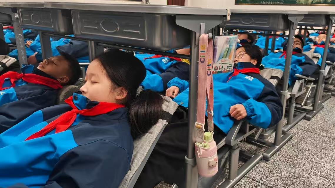 “一拉、一翻、一靠。”仅需三步,上课时端坐的桌椅就变成“可躺式”桌椅。据悉,这些“可躺式”课桌椅的旁边还标有刻度,分为多个不同的档位,学生可以根据自己的身高,轻松找到最适合自己的学习高度,既保证了学习的舒适度,也充分考虑到午休的便利性。