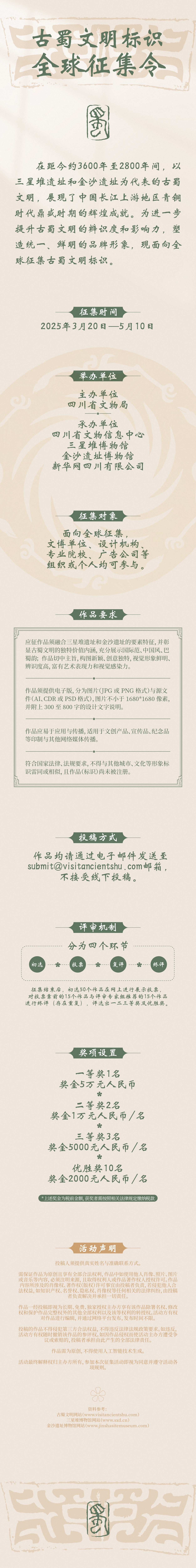 参赛方式:此次征集均采用线上投稿,不接受线下投稿。作品须提供电子版,分为图片与源文件格式,并附上300至800字的设计文字说明,通过电子邮件投递至活动专属邮箱(submit@visitancientshu.com)。更多征集信息可登录古蜀文明网站(www.visitancientshu.com)获取。