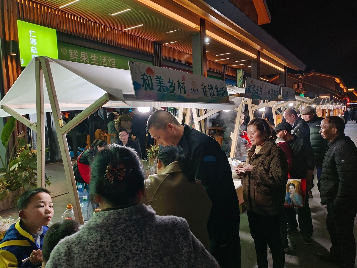 与之呼应的“和美乡村·非遗集结”家乡大集同样人气爆棚。仁寿本地特色小吃香气四溢,区域非物质文化遗产、民间民俗技艺、乡村好物等令人目不暇接,诸多市民游客穿梭其间,赏民俗、品美味、购好物,感受仁寿厚重的文化底蕴。