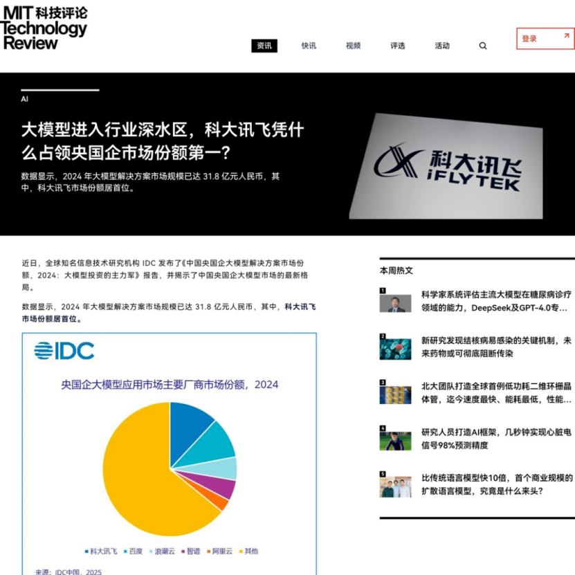 3月19日,IDC发布《中国央国企大模型解决方案市场份额,2024:大模型投资的主力军》报告(以下简称IDC报告)显示,2024年央国企大模型解决方案市场规模达31.8亿元,科大讯飞居榜首。
