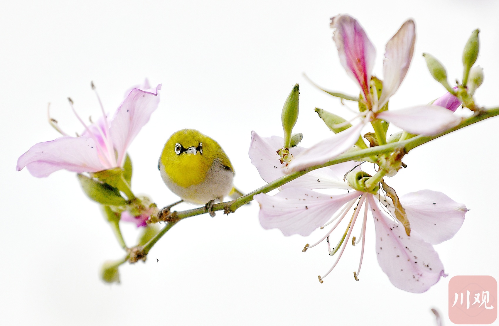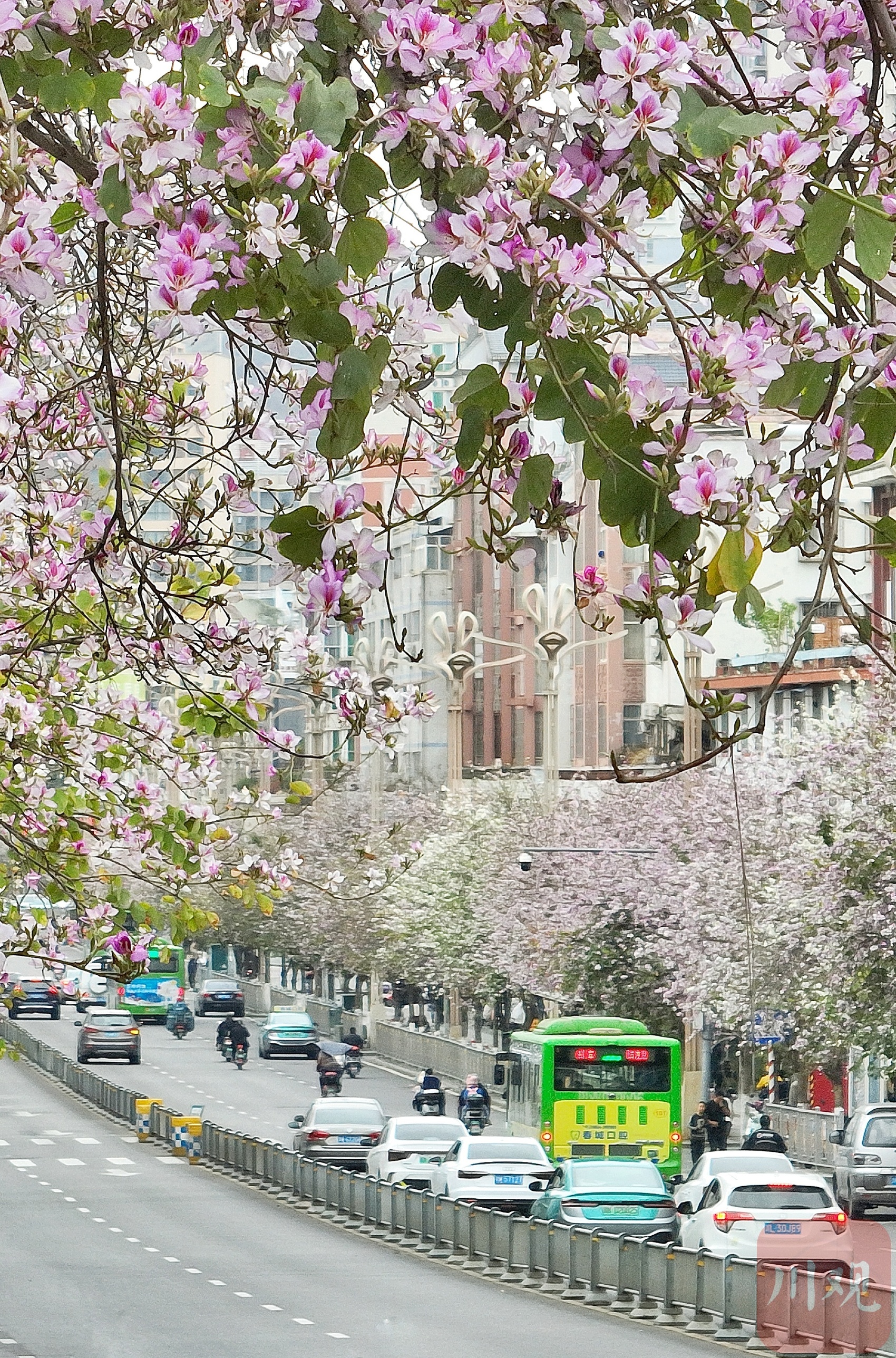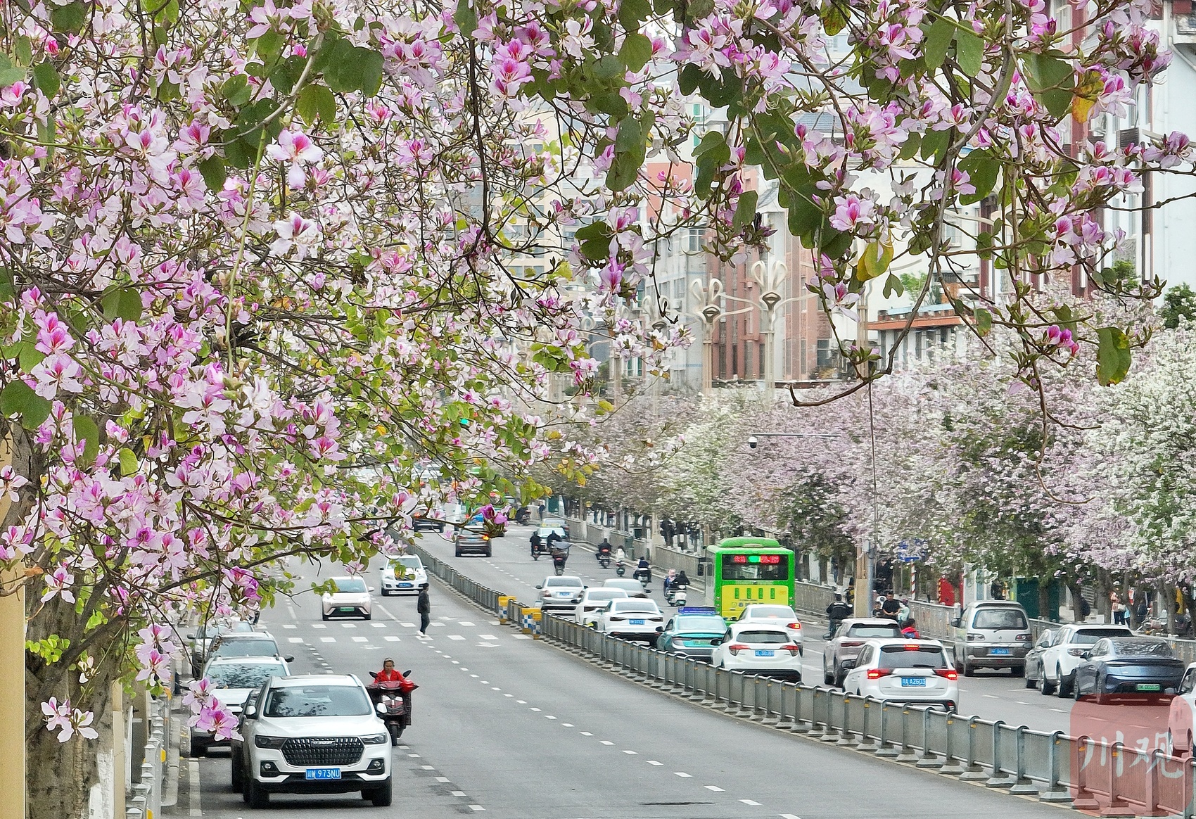 三月的西昌,迎来了一年中最浪漫的视觉盛宴。23日,在胜利北路一带的沿街两侧,大片宫粉紫荆在暖阳下舒展身姿,满树繁花如粉色云雾般笼罩街道。宫粉紫荆又称洋紫荆,花瓣呈淡粉色或浅紫色,记者在现场还观察到白色花瓣。它们随风摇曳,形似翩翩蝴蝶,成群的灰腹绣眼鸟也在花枝间觅食。每年三月,西昌的宫粉紫荆进入盛花期,尤其是风吹过时的“花瓣雨”场景,层层叠叠的粉色花朵与蓝天白云相映成趣,吸引大量游客和当地人驻足拍照。他们说,西昌的春天不止有蓝花楹,宫粉紫荆的柔美同样值得驻足欣赏。快抓住花期,去邂逅这份转瞬即逝的粉色浪漫吧。