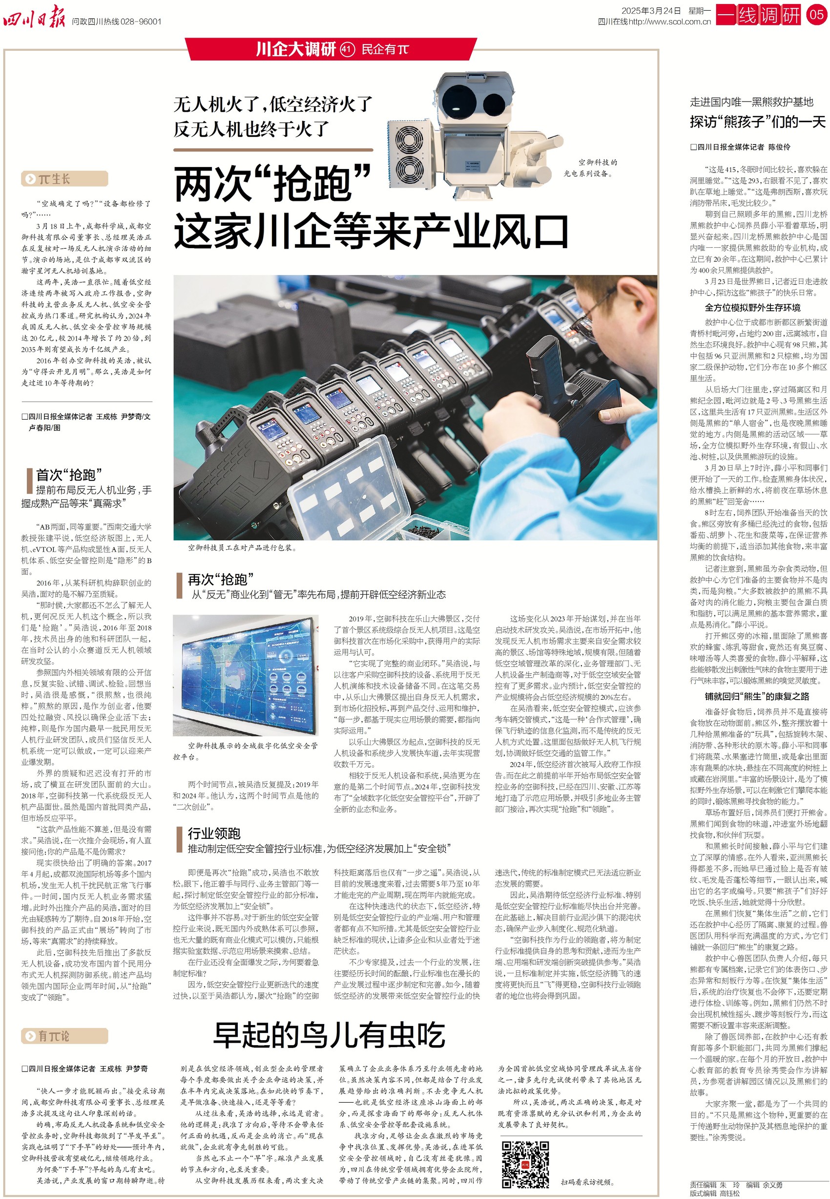 3月18日上午,成都空御科技有限公司董事长、总经理吴浩,正在位于成都市双流区的瀚宇星河无人机培训基地反复核对一场反无人机演示活动的细节。近两年,随着低空经济连续两年被写入政府工作报告,因空御科技的主营业务反无人机、低空安全管控成为热门赛道,吴浩忙碌了起来。2016年创办空御科技的吴浩,被认为“守得云开见月明”。关注今日五版,看空御科技用两次“抢跑”等来产业风口。