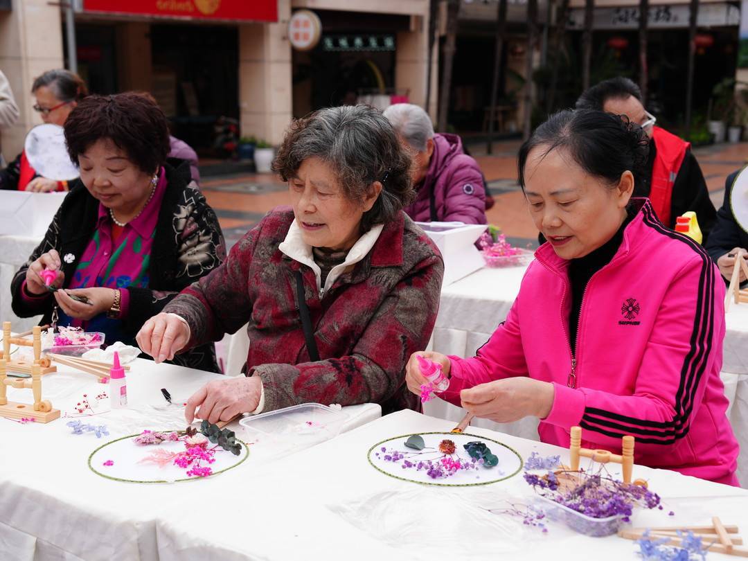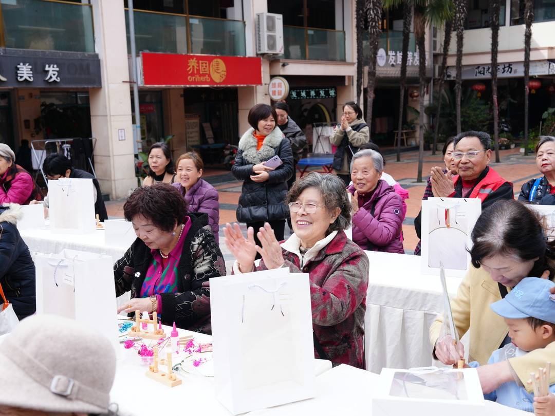 木扇DIY环节更是热闹非凡。各式干花、流苏琳琅满目,居民小陈巧妙地将紫藤花粘贴成扇形,题上苏轼名句“春江水暖鸭先知”。“没想到传统文化可以这么‘潮’!”她兴奋地展示作品,“这把扇子我要送给妈妈。”
